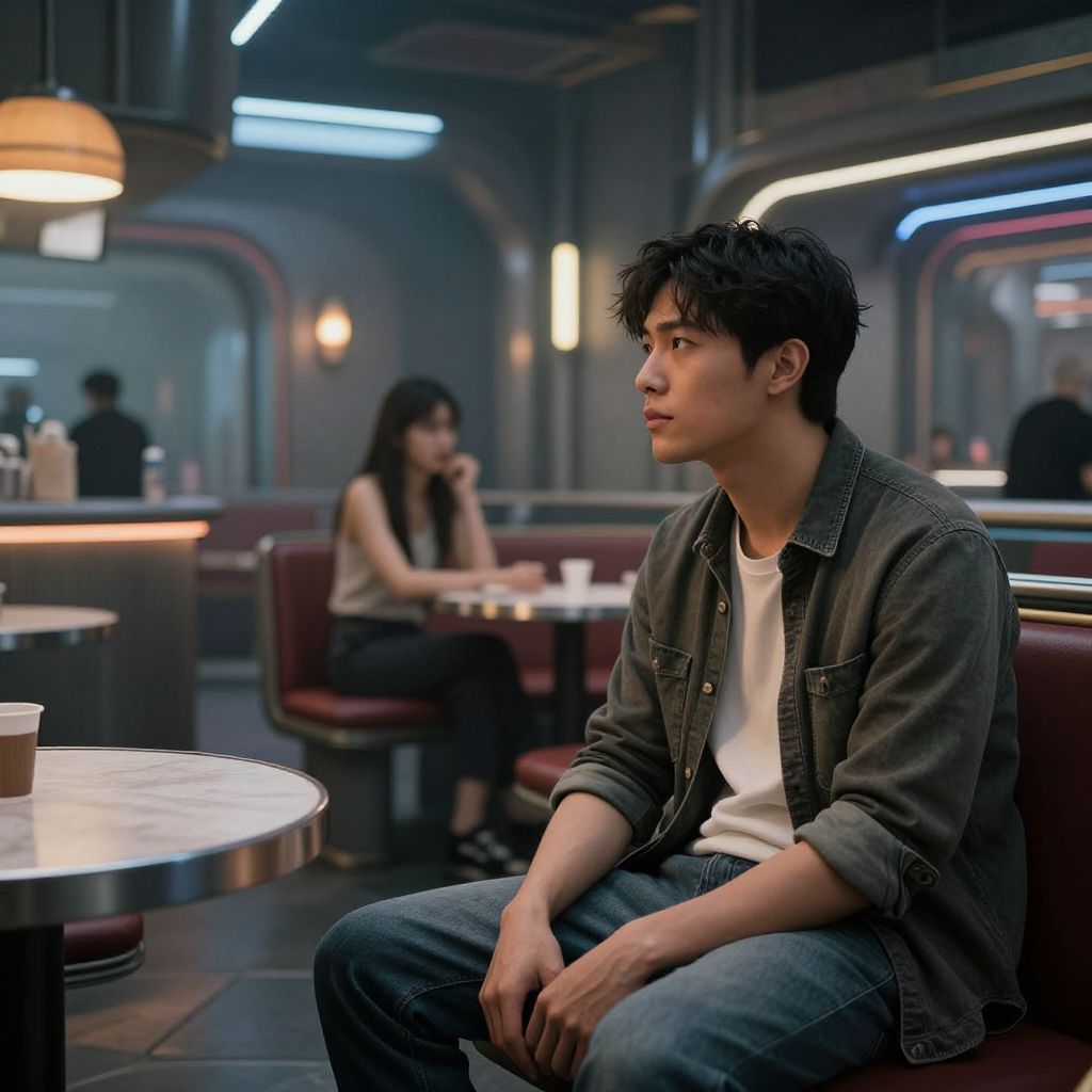 Photograph of an Asian man with short black hair, wearing a denim shirt and white tee, sitting alone in a dimly lit, futuristic diner,