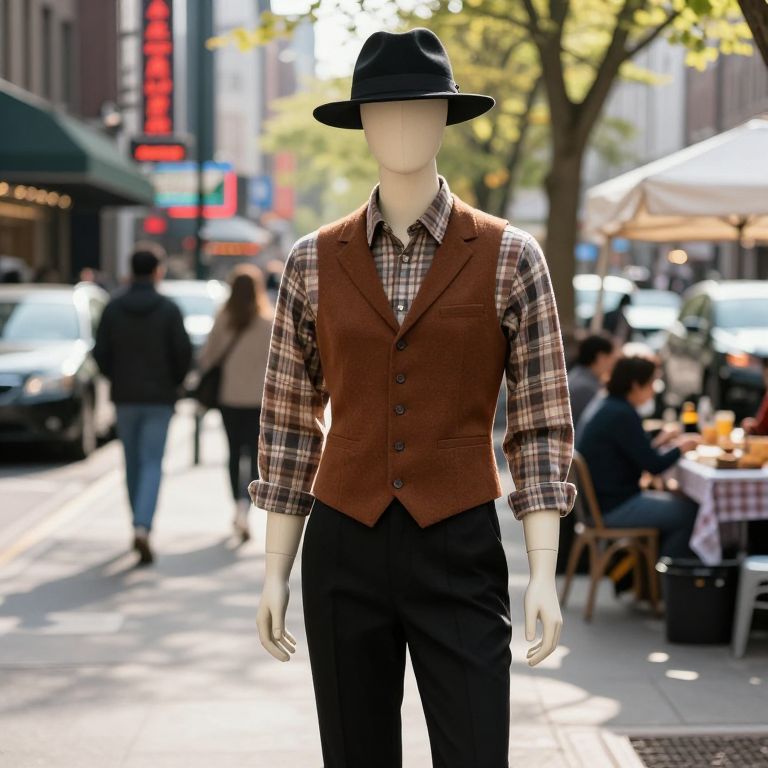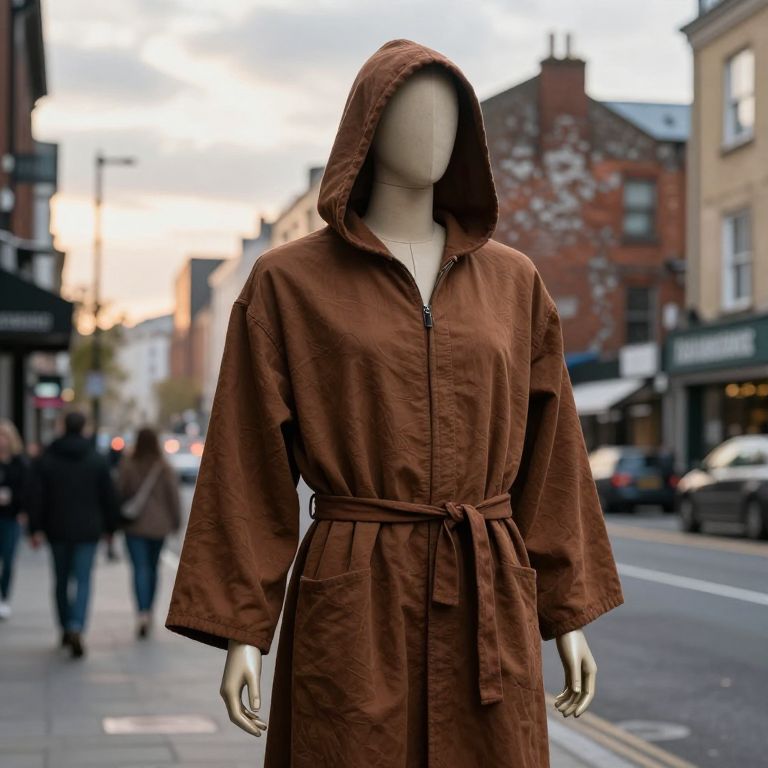 A mannequin wearing a brown robe with a hood and a belt around the waist, standing upright on a busy city street, with a weathered brick building in the background, soft afternoon sunlight filtering through the clouds, pedestrians walking by in the distance, realistic texture on the robe and subtle details on the mannequin's fabric and metal joints, the scene feels slightly surreal yet grounded in a modern urban environment.