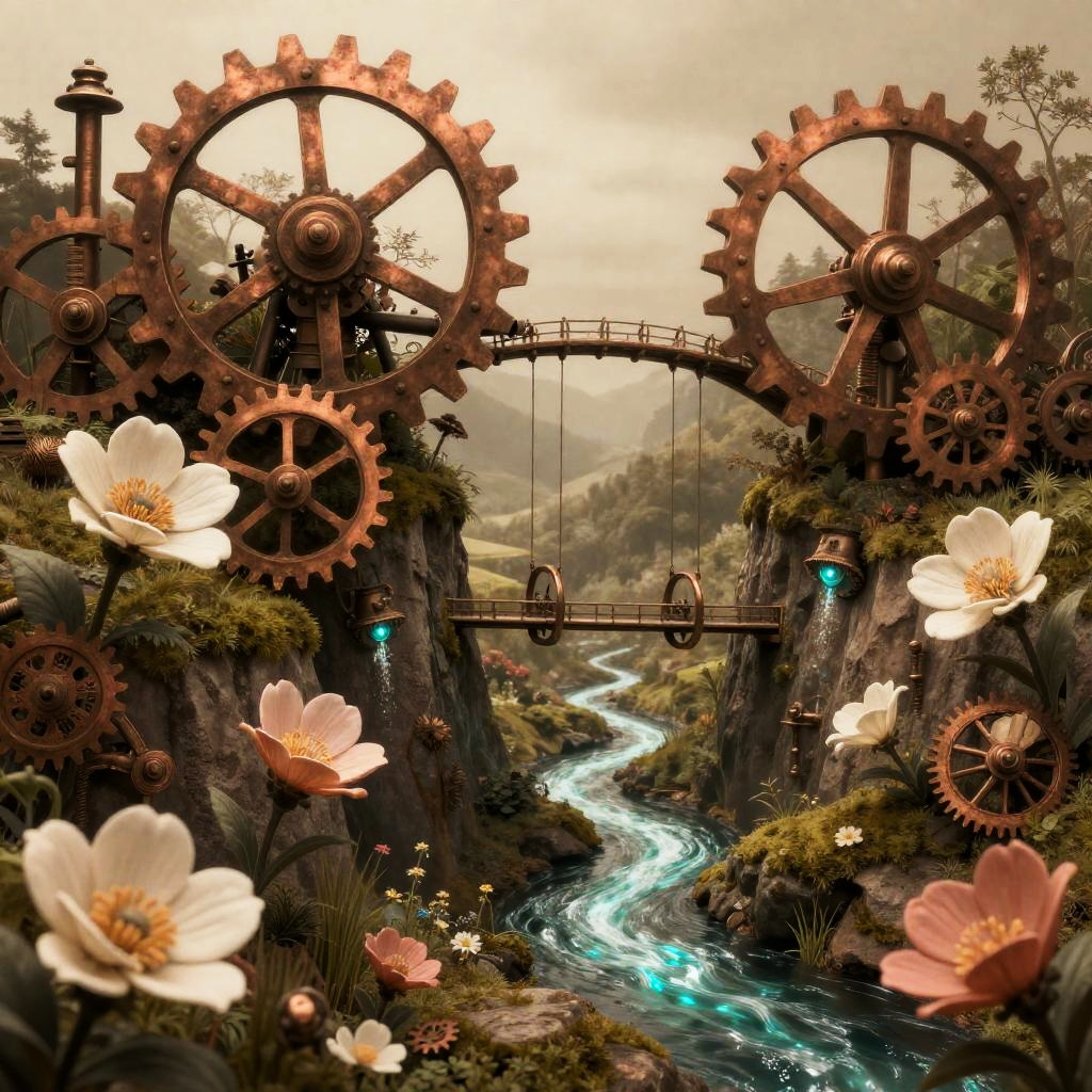Fantasy digital art: Rusty gears and bridge over turquoise river, surrounded by blooming white and pink flowers, amidst rocky cliffs.
