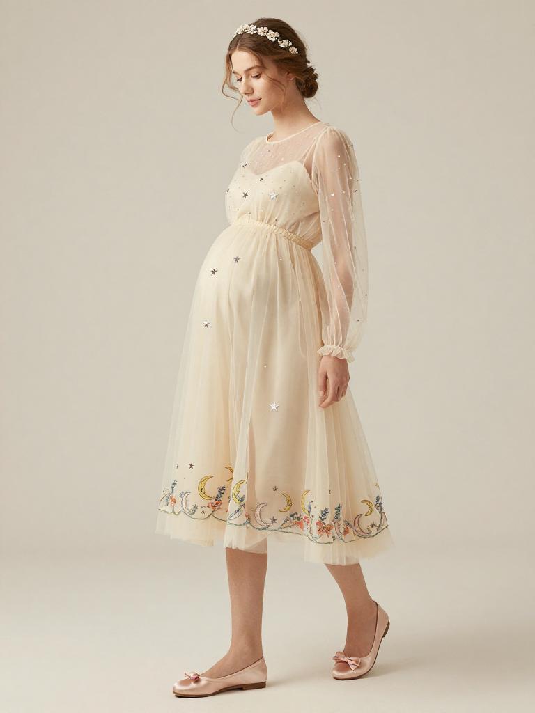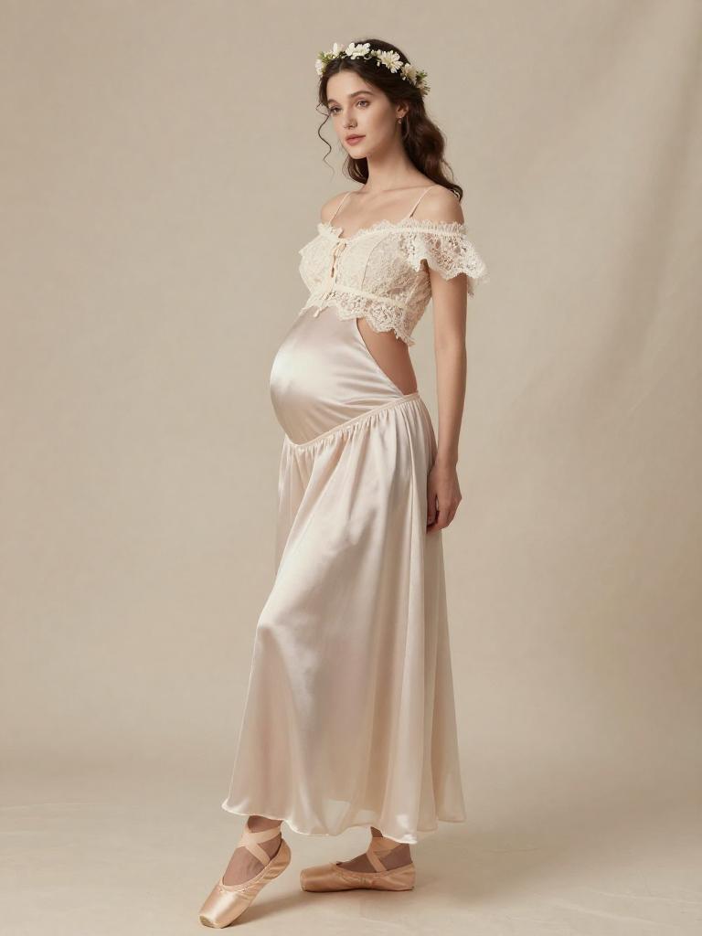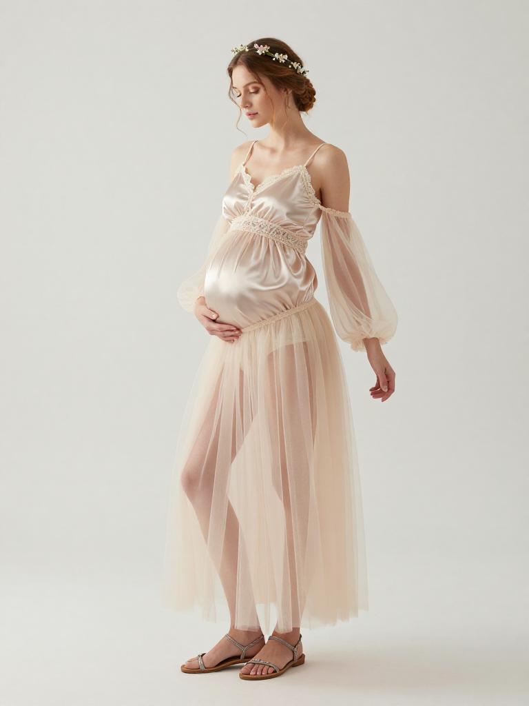 Pregnant fashion outfit, serene pregnant woman with honey-brown hair swept into a relaxed low bun and plus-size pregnant body with full curves and defined bump, dressed in a fairy outfit, whimsical ethereal style, wearing delicate off-shoulder lace crop top designed for pregnancy with lightweight satin maxi skirt with gentle pleats and barefoot with dainty anklets, floral headband, romantic ethereal maternity look, standing in cream-colored seamless paper backdrop studio background, soft dreamy lighting, high-end maternity fashion photography, ultra-detailed