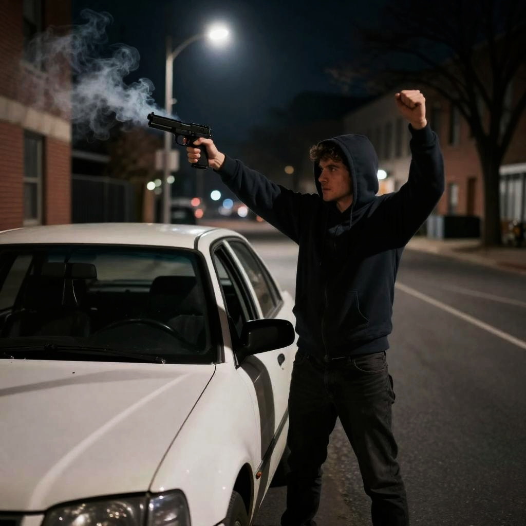 Bearded man with messy hair holding rifle, dirty clothes, black jacket, standing in front of red car with bright headlights, forest background, dark and tense atmosphere, second car in foreground, nighttime setting.