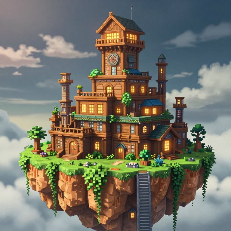 The image depicts a fantastical, pixelated island prison, reminiscent of a Pixar-style animation or a Pokemon anime. The structure is a multi-tiered, wooden building with a tower on top, illuminated by warm, inviting lights. The island is covered in lush greenery, with vines and plants growing on its rocky surface. The sky is a dramatic, cloudy expanse, adding to the mystical atmosphere. The lighting is beautifully rendered, with highlights and shadows creating a sense of depth and realism. The overall composition is balanced, with the building centrally positioned and the surrounding elements enhancing its grandeur. The scene is rich in detail, from the textures of the wood and stone to the intricate design of the windows and doors. The image is a stunning example of 3D rendering, with a high level of realism and attention to detail, achieved through HDR and 4k octane techniques.