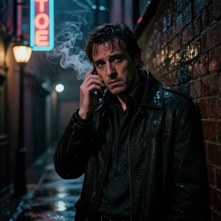 Perplexed detective in a dark rainy alleyway, neon signs flickering above, smoke curling around street lamps, noir style with high contrast shadows and moody lighting, detailed facial expression capturing doubt and intrigue