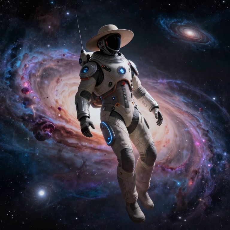 Odell portrayed as a cosmic traveler, floating in space with swirling galaxies and nebulas in the background, futuristic suit with glowing elements, serene yet adventurous mood, high-resolution digital painting with rich cosmic colors