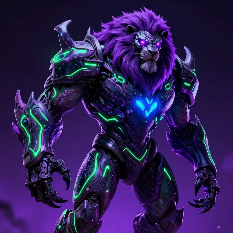 The image depicts a hulking, neon-lit creature that resembles a cross between a lion and a zergling from the StarCraft series. This creature stands tall and imposing, with a muscular, almost armored body that glows with vibrant purple and green neon lights. Its fur is a dark, almost black color, with intricate patterns and textures that give it a rugged, almost organic appearance. The creature's eyes are glowing purple, adding to its menacing presence. Its claws are sharp and pointed, and it has a pair of glowing blue lights on its chest, which seem to pulsate with energy. The overall composition is dynamic, with the creature positioned centrally and filling the frame, creating a sense of dominance and power. The neon lights and glowing elements give the creature a futuristic, otherworldly feel, making it appear both fearsome and other-dimensional.