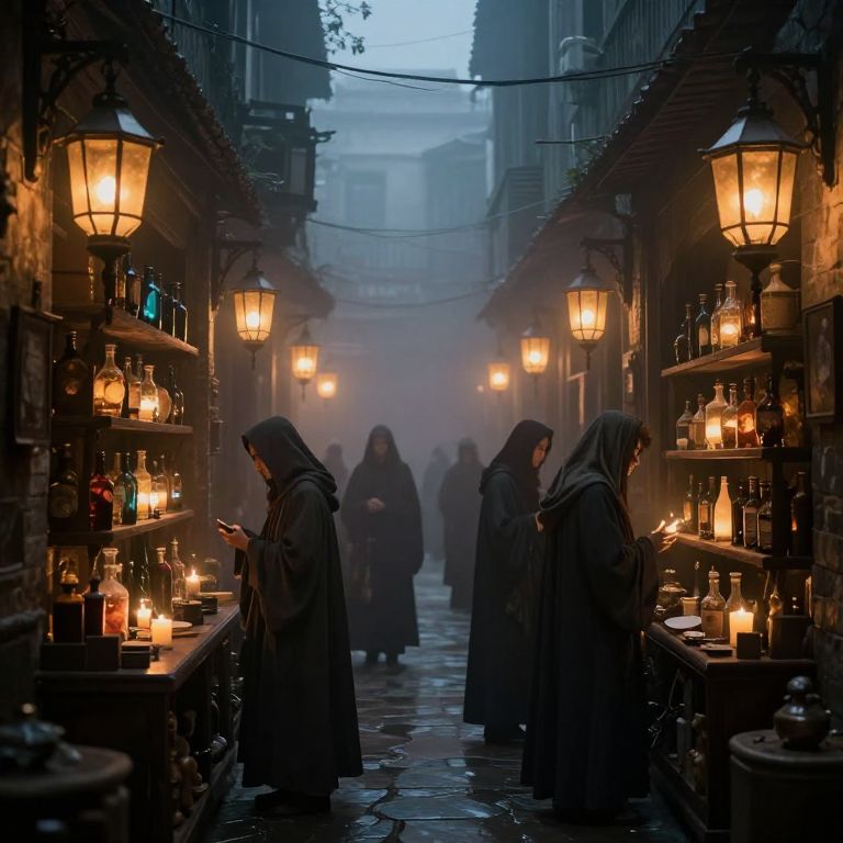 Narrow cobblestone alleyway lined with wooden stalls, each illuminated by warm, glowing glass orbs containing hazy recollections, as figures in long coats walk through the misty, atmospheric scene.