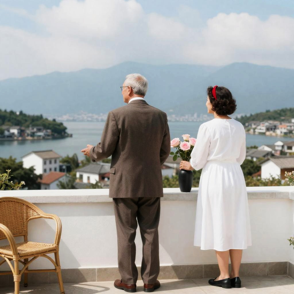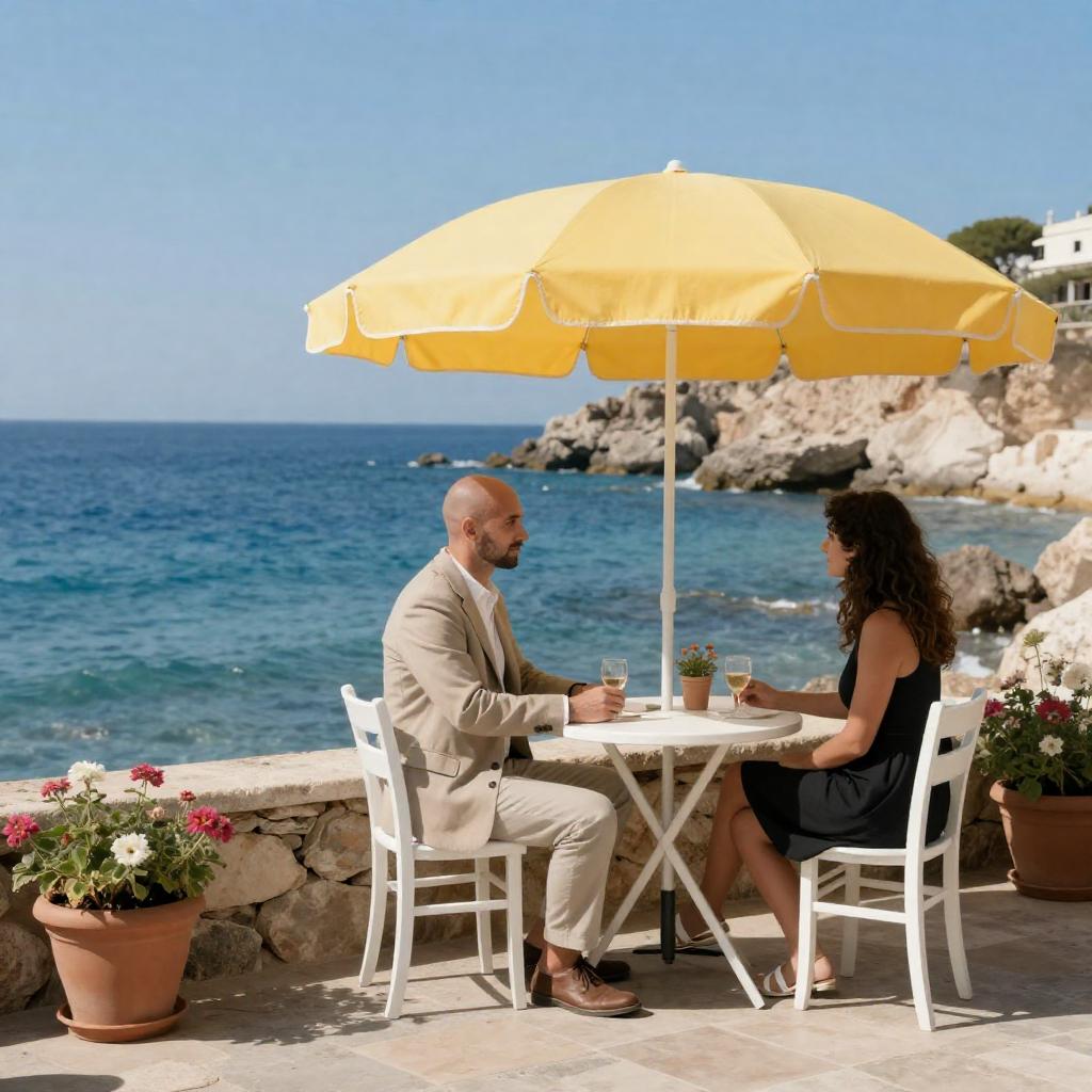 Photograph of a sunny seaside scene: a bald man in a beige suit and white shirt sits at a small white table under a yellow frilled umbrella, facing a woman in a black dress and white sandals. The background features a vibrant blue ocean and rocky cliffs. Potted flowers and a stone wall are in the foreground.