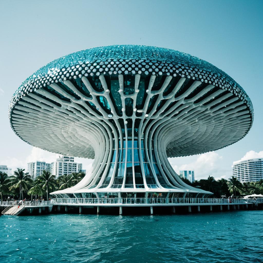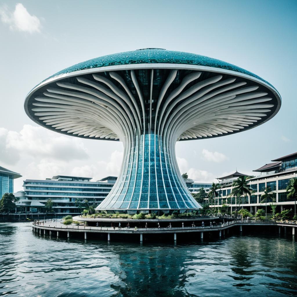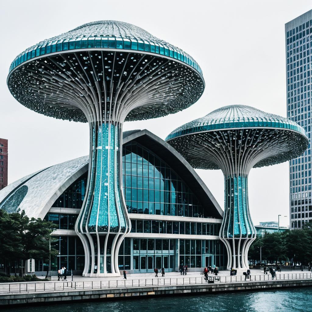Magic Mushroom huge glittering contemporary urban library made of glass and porcelain, iconic architecture inspired by crystalline structures, located on the waterfront of a large Art Deco downtown area