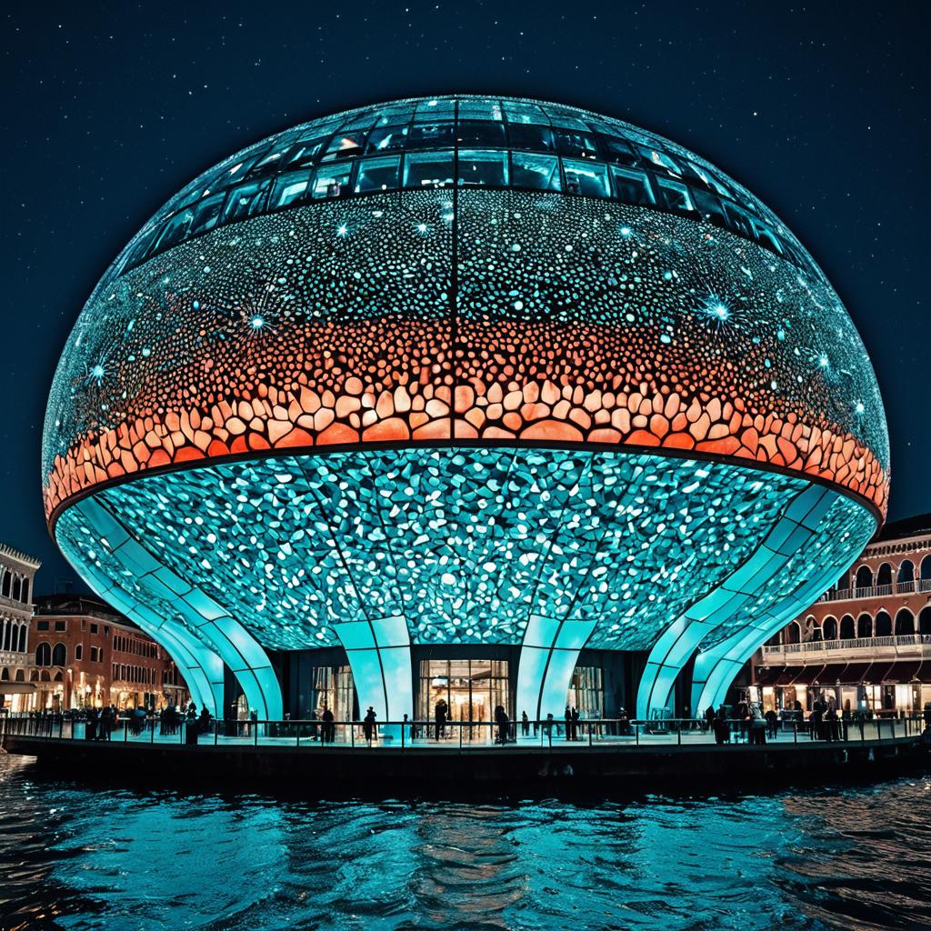 Contemporary urban library designed with a magic mushroom shape, featuring glittering glass and porcelain elements. The iconic architecture is inspired by crystalline structures and is located on the waterfront in a large Art Deco downtown area. The building is surrounded by modern skyscrapers and a promenade where people are walking and relaxing.