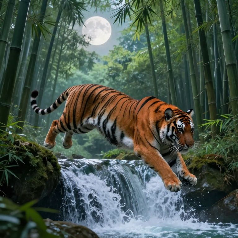 Photorealistic digital art of a tiger leaping over a waterfall in a dense bamboo forest, with a full moon in the background.