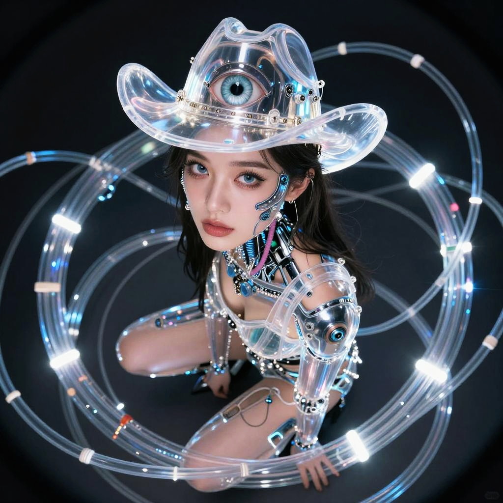 Masterpiece, best quality, glamour (fisheye:0.6) shot (from above:0.9) (close-up:0.5) of a beautiful girl crouching (surrounded:0.6) by swirling glowing cables, xryhd, biomechanical, very intricate, extremely sharp focus, photorealistic, cybernetic eye, (glass:1.2), cowboy shot, transparent, clear plastic, volumetric lighting, style-swirlmagic