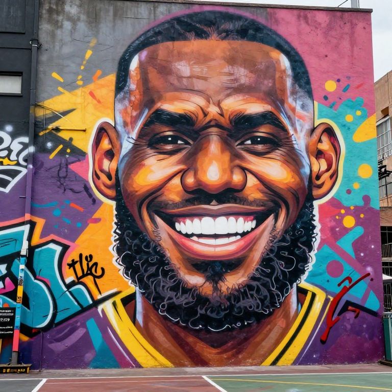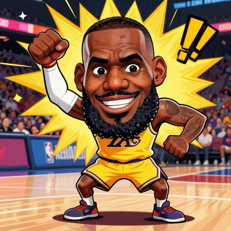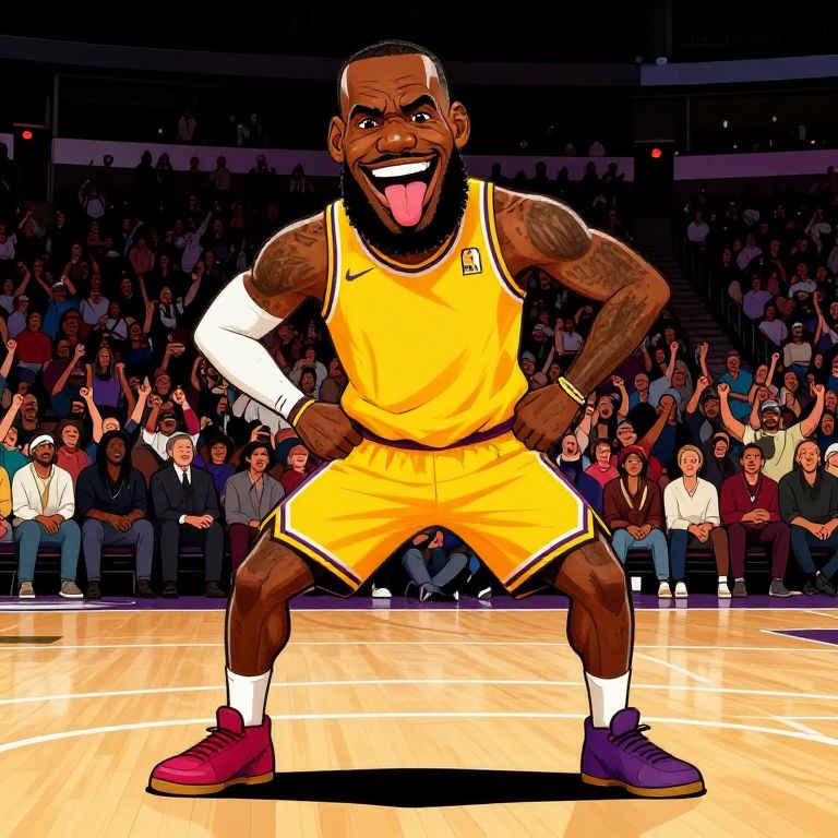 LeBron goofy character sketch, whimsical digital painting, bright neon colors, exaggerated features, fun and humorous ambiance, dynamic basketball action scene