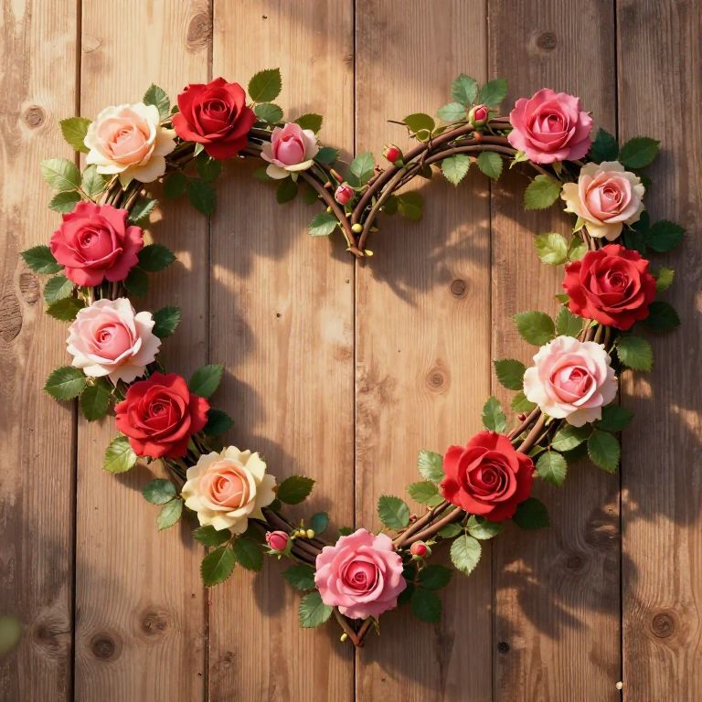 Hearted shape made of intertwined vines and blooming roses, set against a rustic wooden background, with warm sunlight filtering through leaves, evoking feelings of love and nature's embrace.