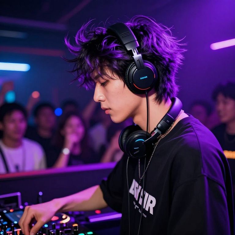 Close-up of black and purple hair male DJ performing in a lively nightclub, energetic crowd in the background illuminated by pulsing purple and blue lights, modern streetwear fashion with futuristic headphones, hair flowing dynamically with vibrant colors
