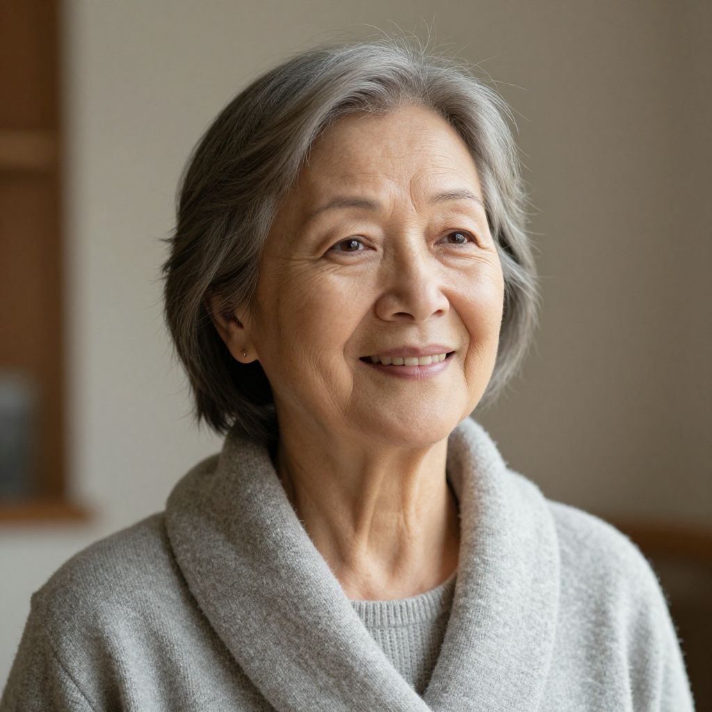 Photograph of an elderly Asian woman with short gray hair, wearing a beige sweater, smiling softly, and looking slightly to the right.