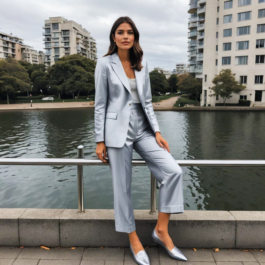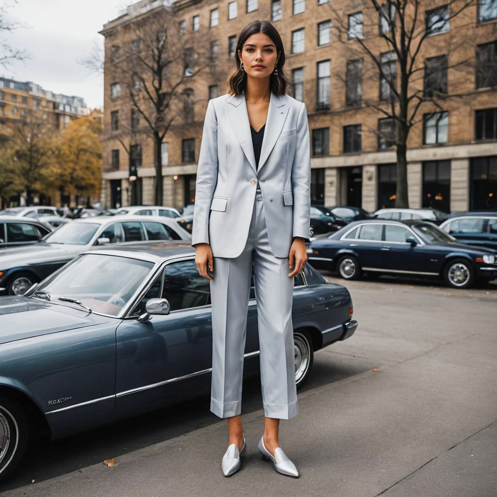 A young woman with medium-length silvery waves hairstyle wearing a tailored silver suit with cropped trousers and classic silver loafers stands on a city street. She is styled in a minimalist, luxe fashion look, with a black top underneath the blazer. The background includes vintage cars and urban architecture with autumn trees.