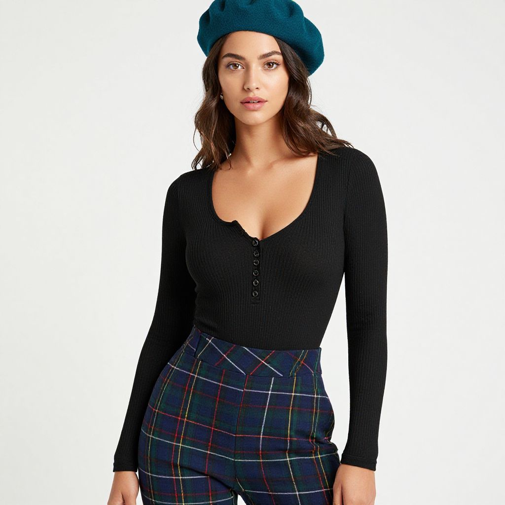 "Woman, casual chic, black ribbed bodysuit with a scoop neckline and button details, long sleeves, paired with fitted plaid trousers in blue, green, and red, high waist, teal beret, studio background with a white seamless backdrop.. Sexy. Pretty face and beаutiful eyes. Big breasts."