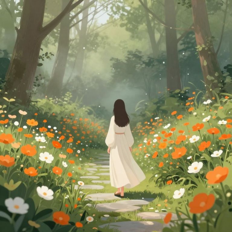 This digital illustration depicts a serene forest scene at sunset. A young girl with black hair, nude, sits in a large green leaf boat on a tranquil, turquoise-colored lake. The lake is adorned with lily pads and white water lilies, and the water reflects the pink and purple hues of the sunset. Tall trees with dark trunks surround the lake, and glowing fireflies are scattered throughout the scene. The girl is centered in the image, with her back to the viewer, creating a peaceful, almost magical atmosphere. The detailed, vibrant colors and soft lighting enhance the tranquil and whimsical mood of the artwork.