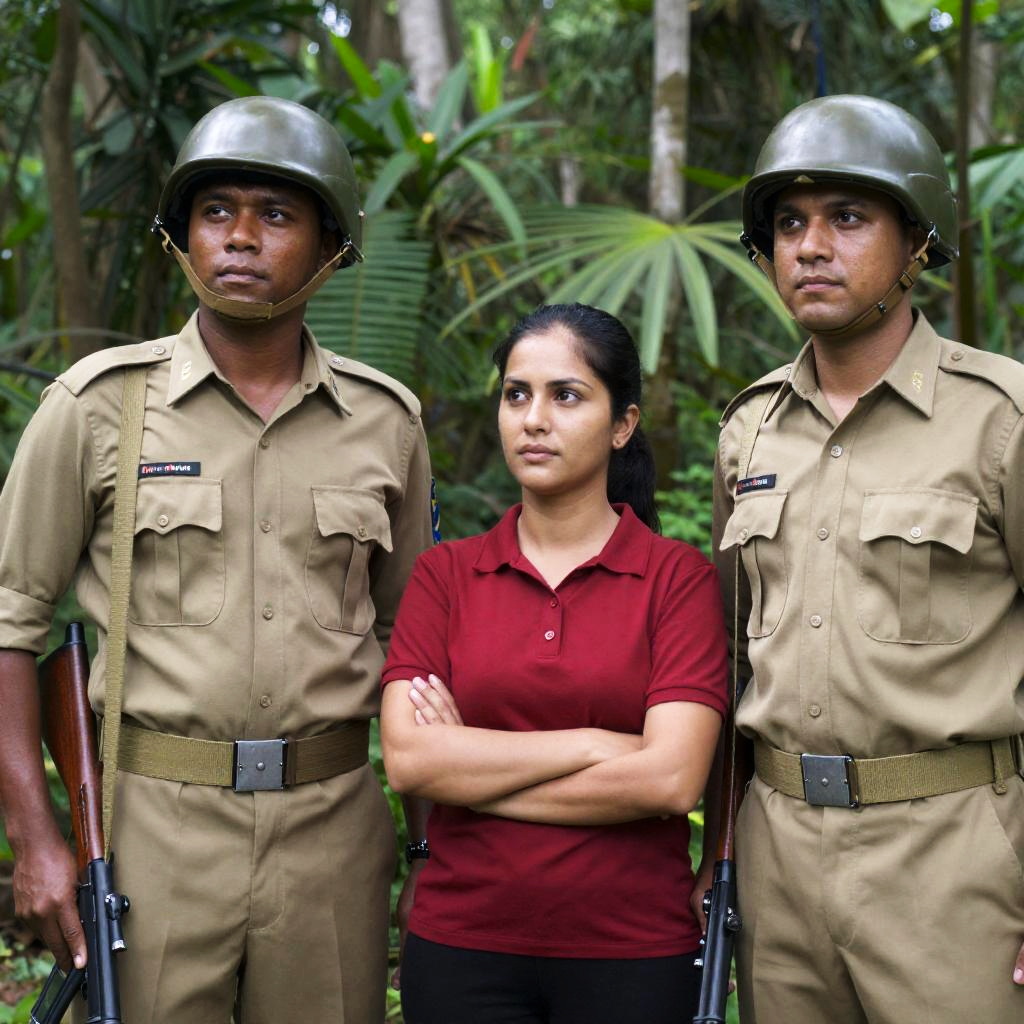 Photograph of five police officers in dark uniforms with caps, one pointing towards a barred window, intense expressions. Woman in black headscarf and patterned jacket in center, officers surrounding her. Bright light from window.
