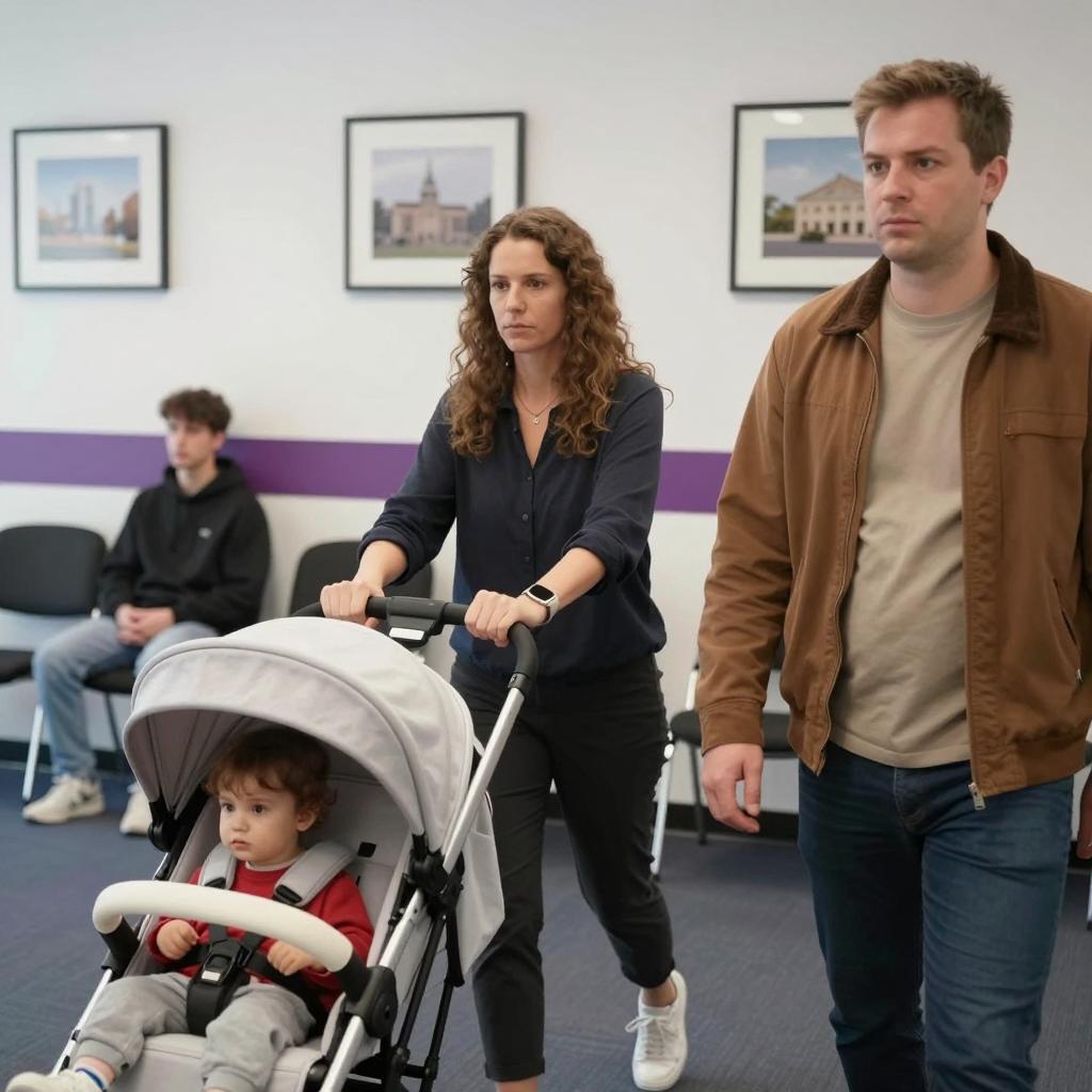 A woman with curly brown hair and dark clothing pushes a white stroller with a young child wearing a red shirt. A man with short brown hair, wearing a brown jacket and beige shirt, stands in the right foreground. In the background, another person sits alone on black chairs. The room has white walls with a purple stripe, black chairs, and framed pictures on the wall. The carpet is dark blue. The woman's expression is neutral, the child's expression is partially obscured, and the man's expression is neutral.