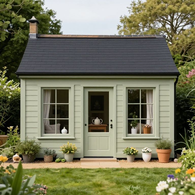 Sage-colored Holkham Summerhouse stands gracefully in a lush garden, featuring a black roof, two large windows, and double doors that reveal a cozy interior with furniture and decor.