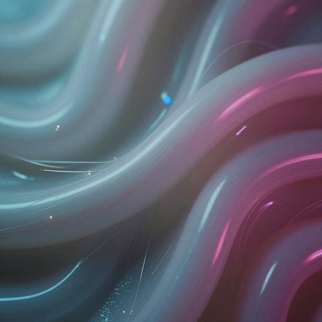 Close-up of synthetic materials texture, smooth glossy surfaces interwoven with glowing fiber optics, abstract pattern blending plastics and metals, iridescent colors shifting from turquoise to magenta, futuristic design with a hint of organic artificiality.