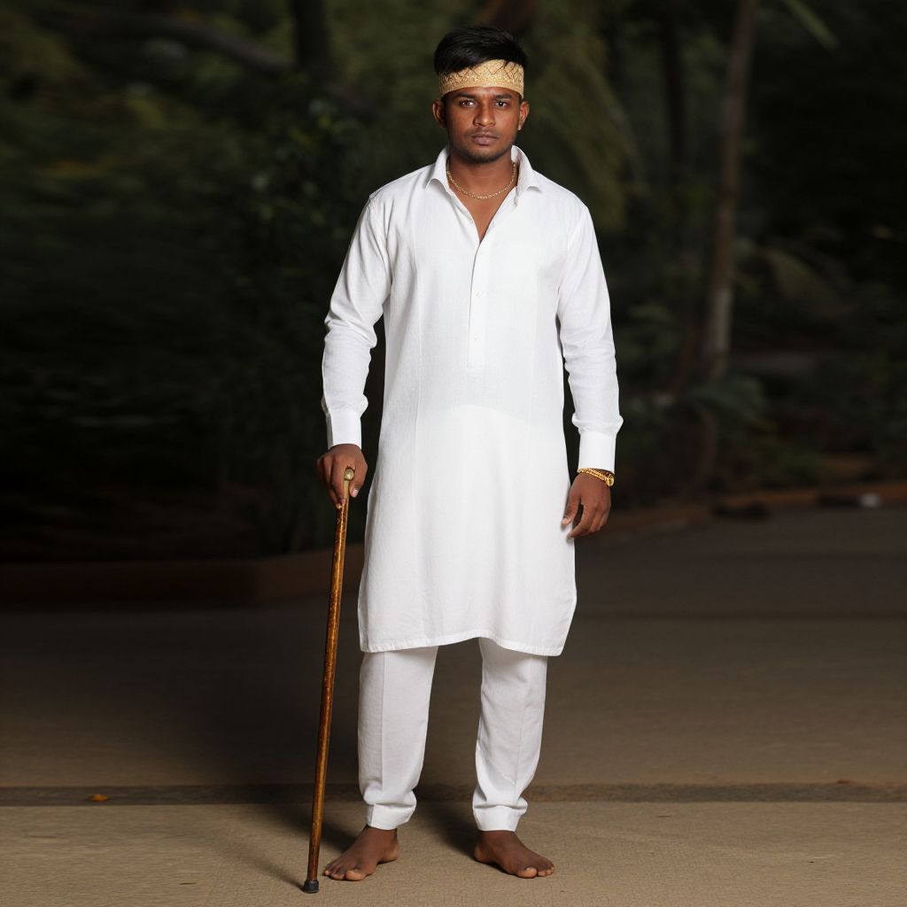 Photograph of a dark-skinned Indian man standing outdoors at night. He wears a white traditional long kurta and pants, with a gold headband and brown sandals. He holds a wooden stick in his right hand. His expression is serious, and he stands on a concrete surface. The background is dark, with indistinct greenery, creating a contrast with his white attire. The lighting highlights his figure, casting subtle shadows. The overall mood is solemn and traditional.