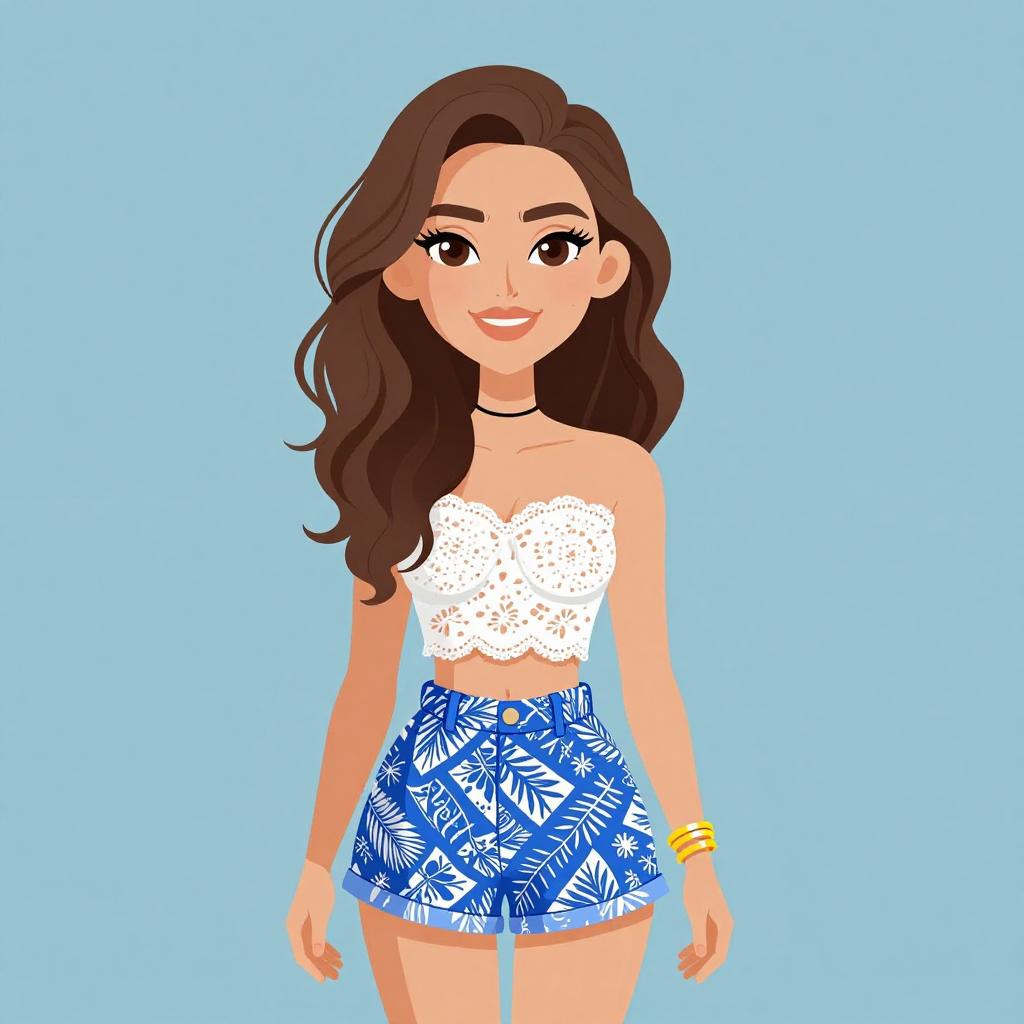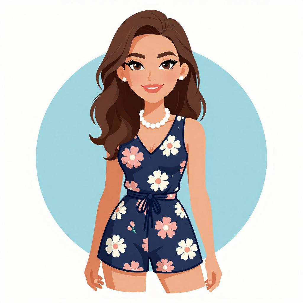 Woman with pretty face and pretty hair. smiling Woman, summer clothing, navy romper with pink and white floral print, V-neckline with tie front detail, sleeveless, cinched waist, short length, white beaded necklace. --sref 1467