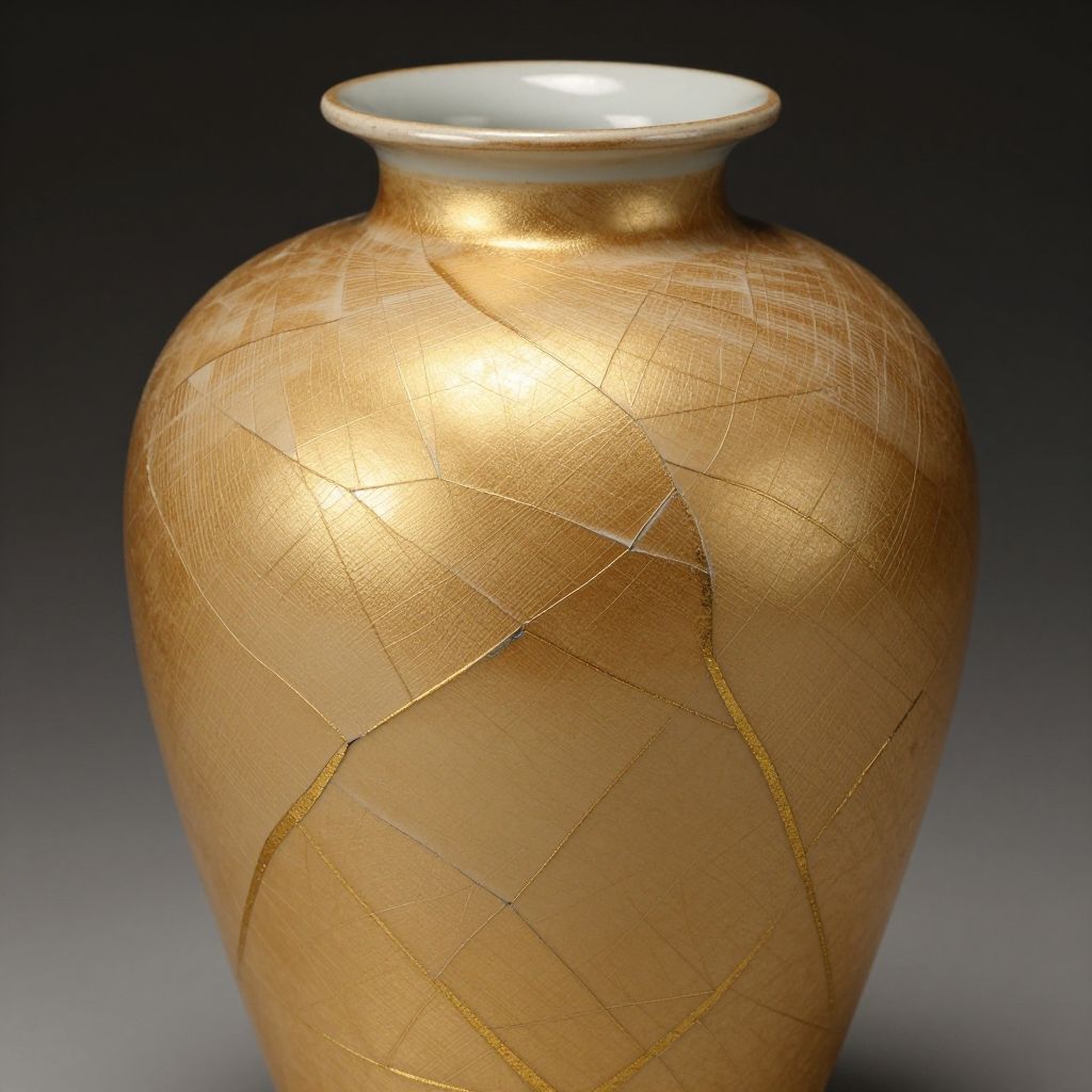 Kintsugi pattern adorning a shattered porcelain vase, shimmering gold veins repairing the fractures, traditional Japanese aesthetics, warm tones, delicate craftsmanship