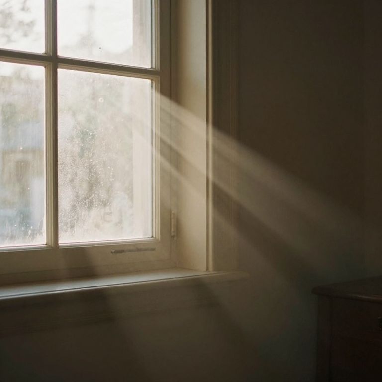 A cozy indoor scene with rays of light entering through a dusty window, casting soft shadows and creating a warm, inviting ambiance with gentle light beams illuminating the room