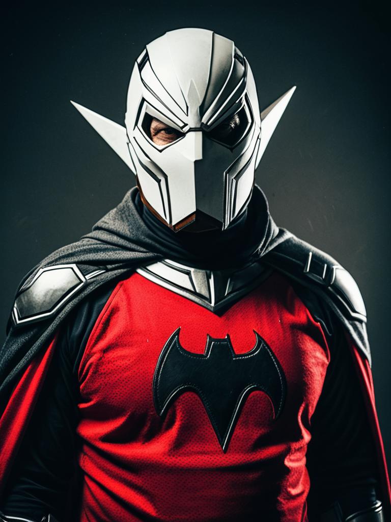 Studio portrait of a man wearing a red and navy blue jersey costume with a zipper and logo emblem. The man has dark hair and a beard, posing against a dark, plain background with realistic lighting and tones.