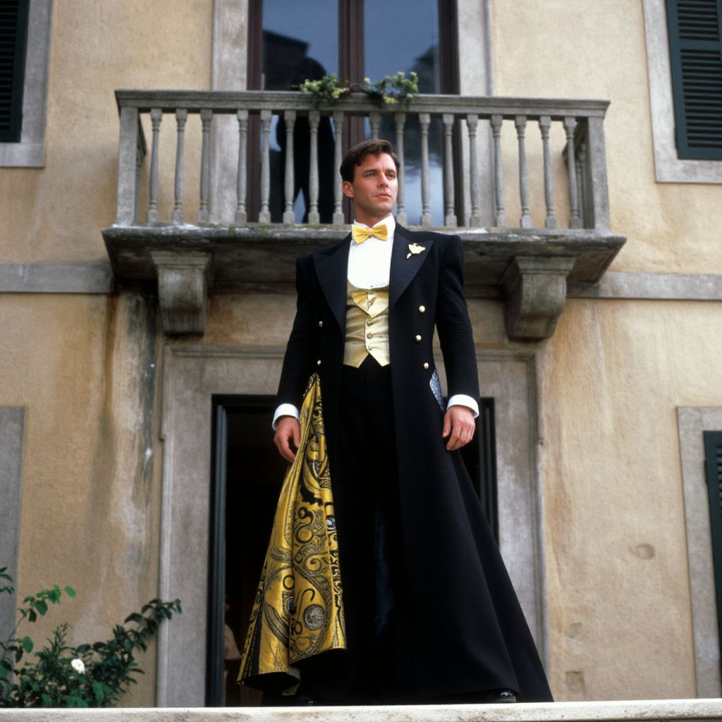 Photograph of a young Caucasian man with short brown hair, standing on a stone balcony in front of a beige, stucco building with black shutters. He wears a black tuxedo with a long black coat, a white shirt, and a yellow bow tie and vest. In his right hand, he holds a gold and black patterned cloth. The balcony has a stone balustrade, and a small potted plant is visible at the bottom left. The man looks confidently to the side, with natural daylight highlighting his formal attire.