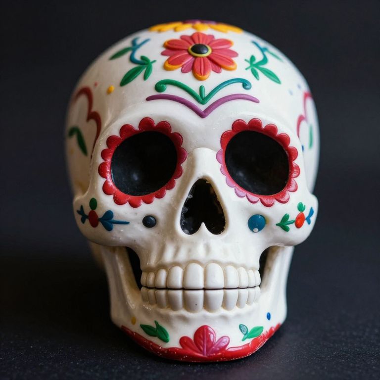An intricate sugar skull invites introspection, blending the solemnity of mortality with the vibrant celebration of life, evoking a paradoxical dance between melancholy and exuberance.