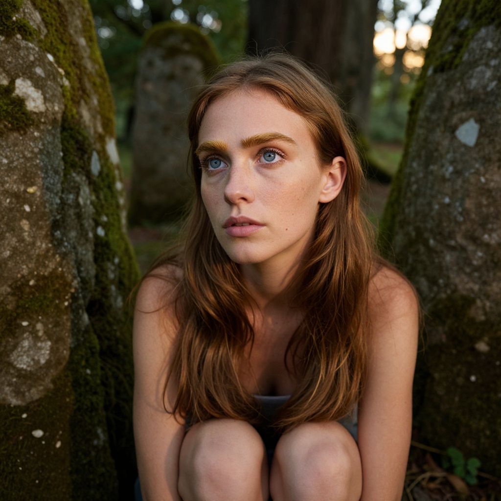 A portrait photograph captures the enigmatic essence of a European woman with piercing sapphire eyes, framed by thick, golden-brown eyebrows. Illuminated by the soft, diffused light of a setting sun, she sits amidst an ancient grove, depicted from a unique 'worm's-eye view'. Towering, moss-covered stones seem to embrace her as she crouches, her lush, chestnut hair cascading down her back. The warm light highlights the natural golden tones of her flawless skin, while subtle freckles and a faint birthmark on her right cheek add depth and a sense of realism to her visage. Her thoughtful gaze into the distance evokes a sense of tranquility and introspection, inviting viewers to ponder the untold stories that lie within her captivating, sapphire eyes.