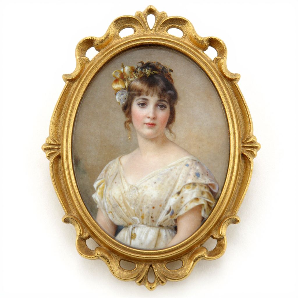 Elegant Art Nouveau brooch featuring a hand-painted porcelain portrait of a woman in a cream dress, set within a scrolled gold frame, circa 1900-1910s.