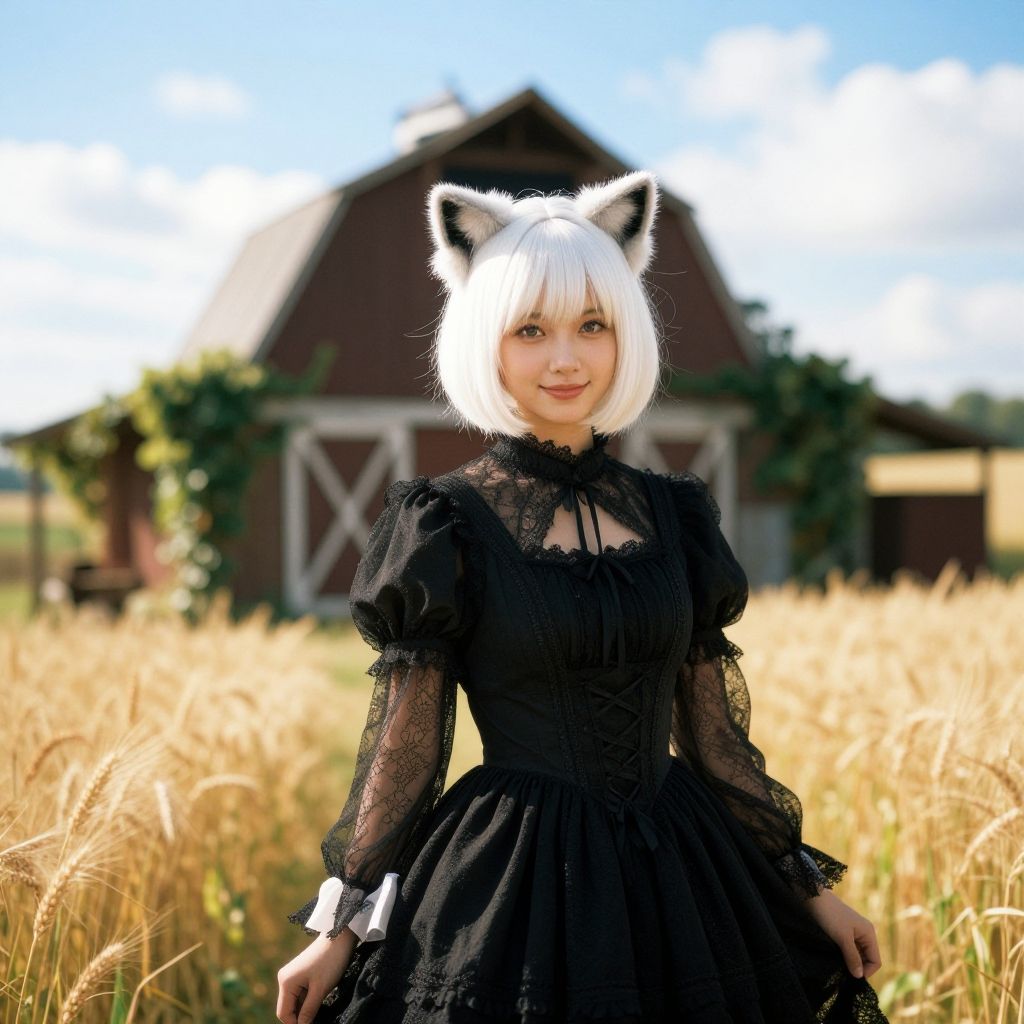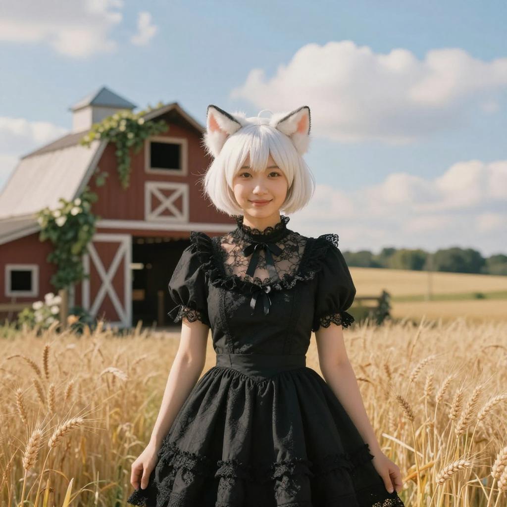 Photograph of a young woman with white cat ears, short white hair, and black lace dress, standing in a golden wheat field with a red barn