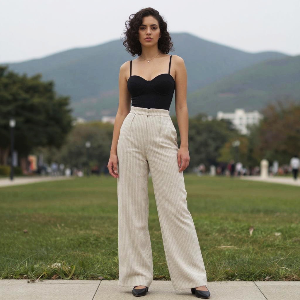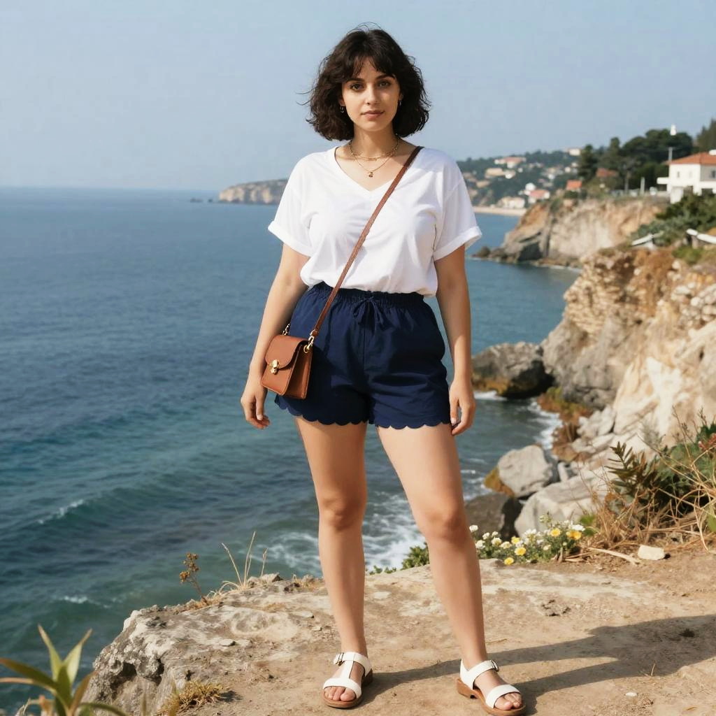 A voluptuous woman in a Studio Ghibli style, dressed in a casual summer outfit featuring a loose white V-neck T-shirt and navy scallop-edged shorts, stands on a scenic seaside cliff wedding, accessorized with a thin brown leather crossbody bag and white sandals, adorned with layered necklaces. Sexy. Pretty face and beutiful eyes