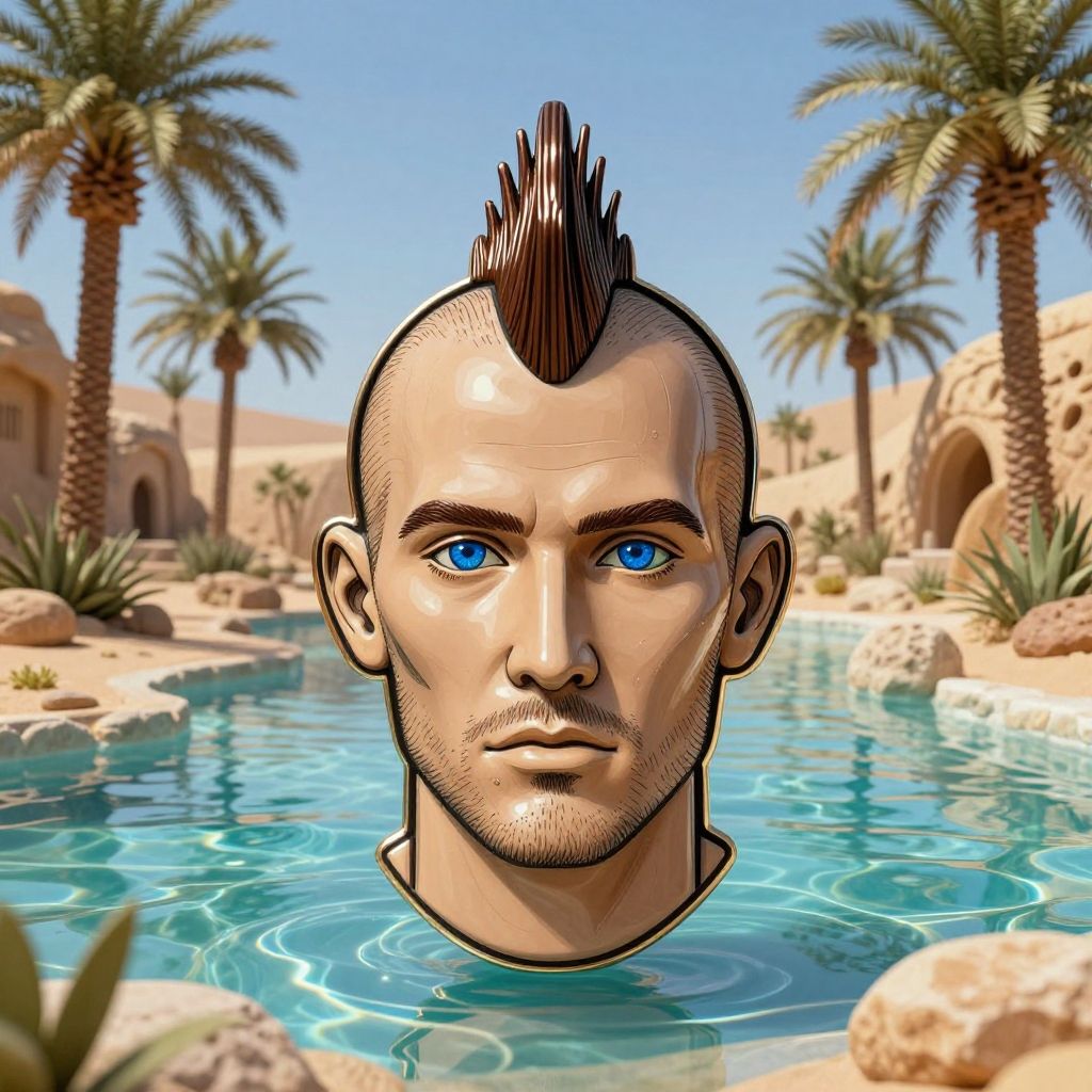 Line art trinket depicting a Sorcerer, Don, Short, Solid, Oval Face, Tan Skin, Brown Hair, Blue Eyes with Green Flecks, Narrow Nose, Thick Lips, Sharp Chin, Stubble, Very Long, Mohawk, A desert oasis, with shimmering pools of crystal-clear water and palm trees swaying in the breeze Wim Wenders, natural, shimmering, vibrant, gothic, rpg, 1400ad, ultra detailed, detailed, immersive, reminiscent of high fantasy RPG games, HD, masterpiece, best quality, hyper detailed, super realistic, perfect face, perfect hands, award-winning, professional, breathtaking, linquiverasumptuous Dunegray weatherbreathtaking . award-winning