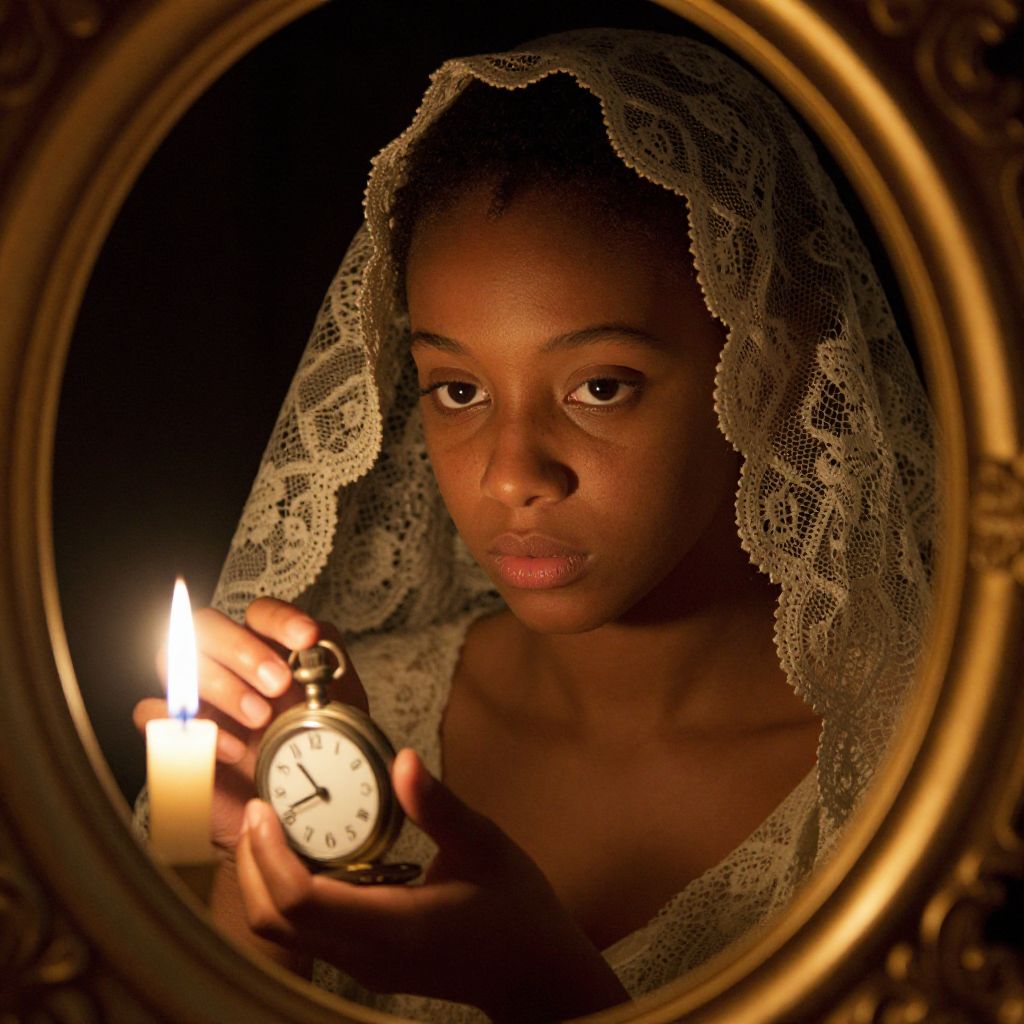 Photograph of a young Black woman with lace veil, holding a lit candle and antique pocket watch, reflected in a golden-framed mirror, with a