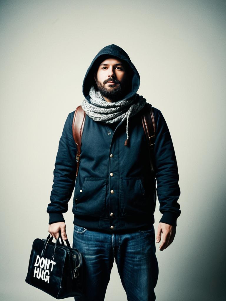 Dont hug scared costume, 1boy, solo, male focus, bag, beard, facial hair, full body, hood, standing, scarf