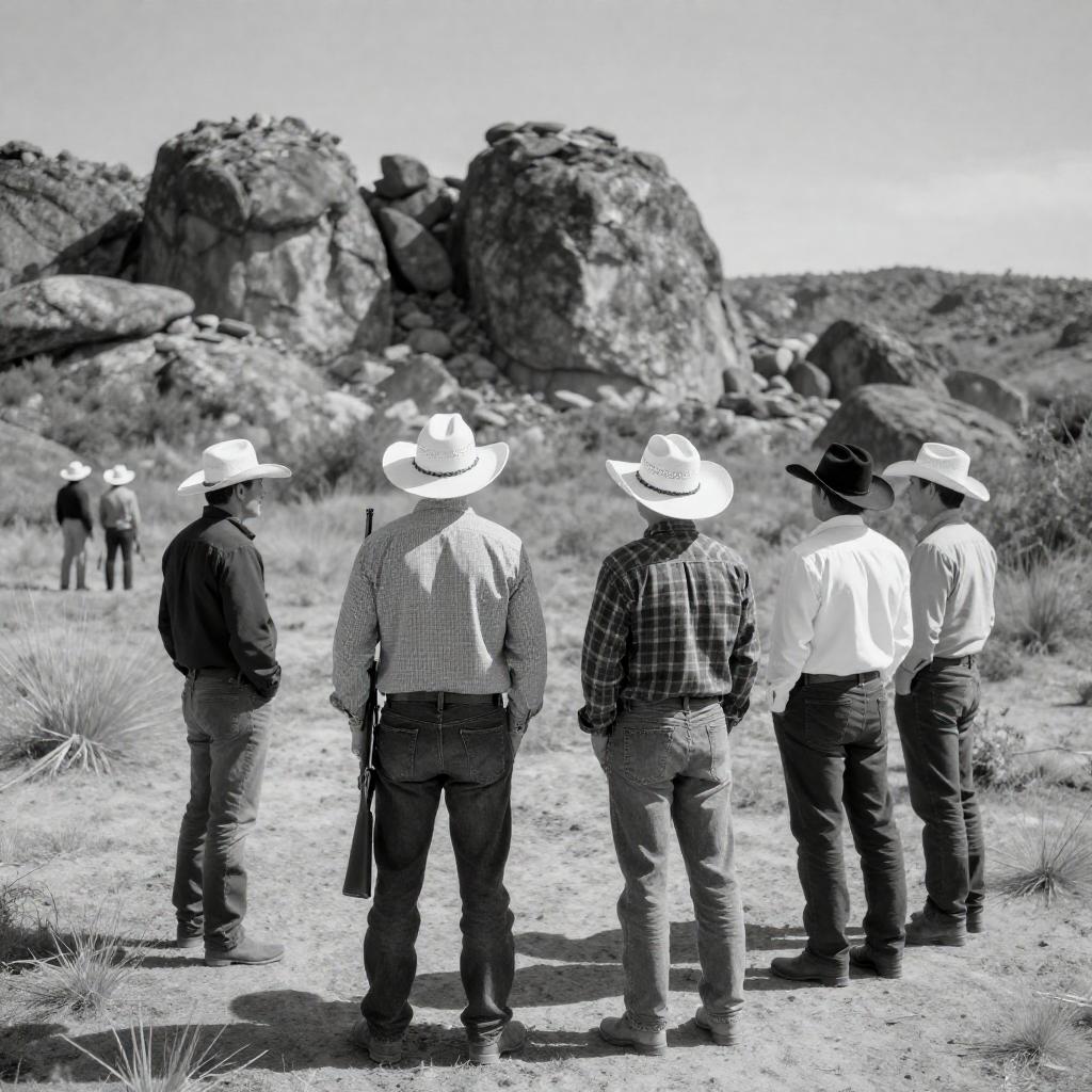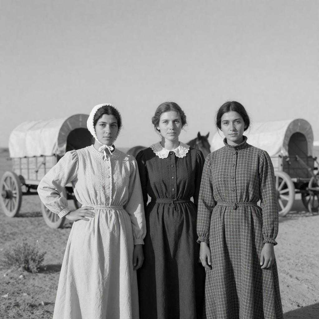 Black-and-white photograph of a Western scene. A bearded man in a checkered shirt, vest, and cowboy hat stands beside a wooden wagon. Another man beneath the wagon works on a wooden beam. In the background, a group of people and two wagons are visible on a dusty plain.
