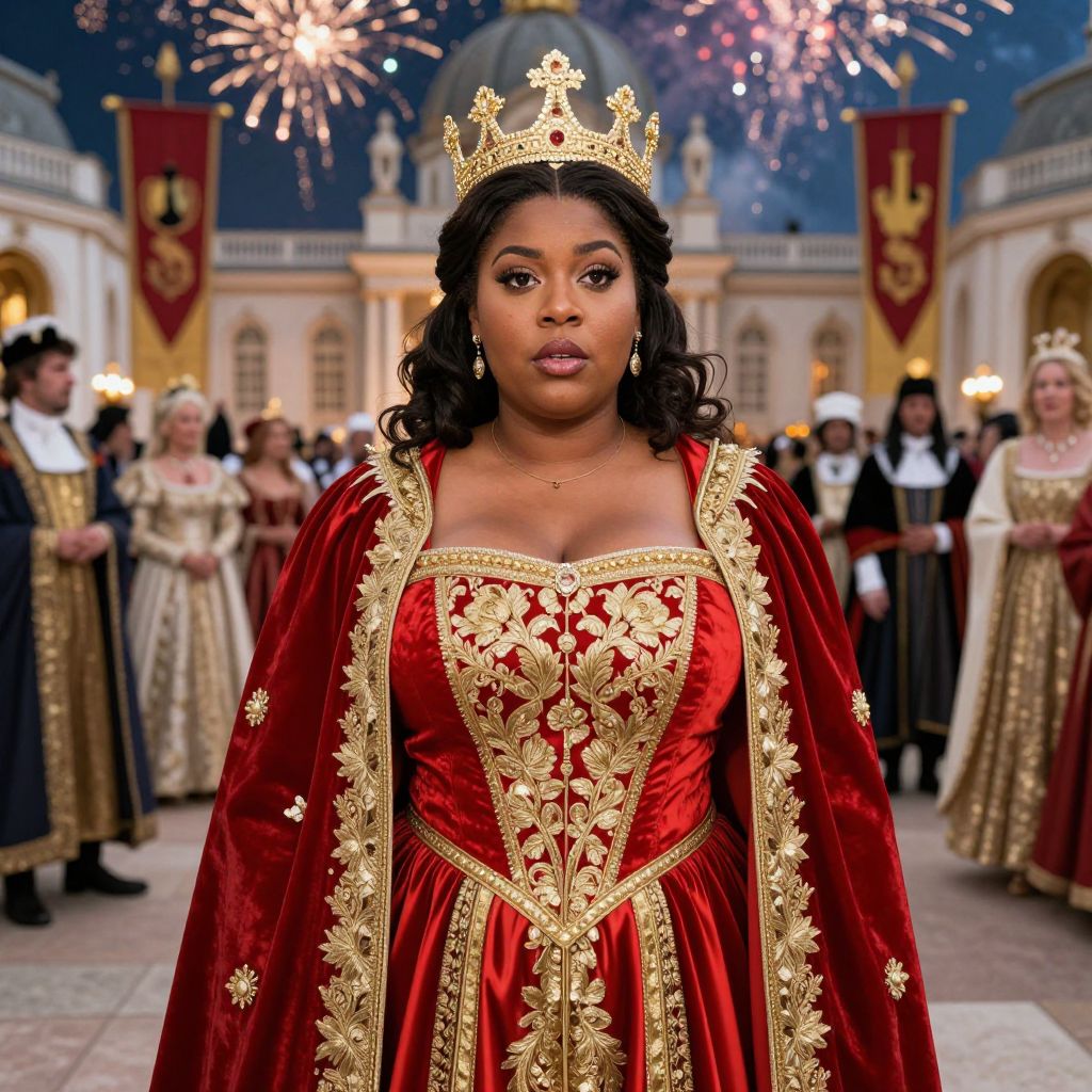 Photograph of a Black woman with medium brown skin and curly black hair, wearing a gold crown and a lavish red velvet gown adorned with intricate gold embroidery and floral patterns. She stands in the foreground of a grand, baroque-style hall with a blue dome ceiling and large, colorful fireworks in the background. Surrounding her are other people in ornate, historical costumes, including women in gold and red dresses and men in black and white attire. Red banners with gold designs hang on the walls. The image has a festive, royal atmosphere.