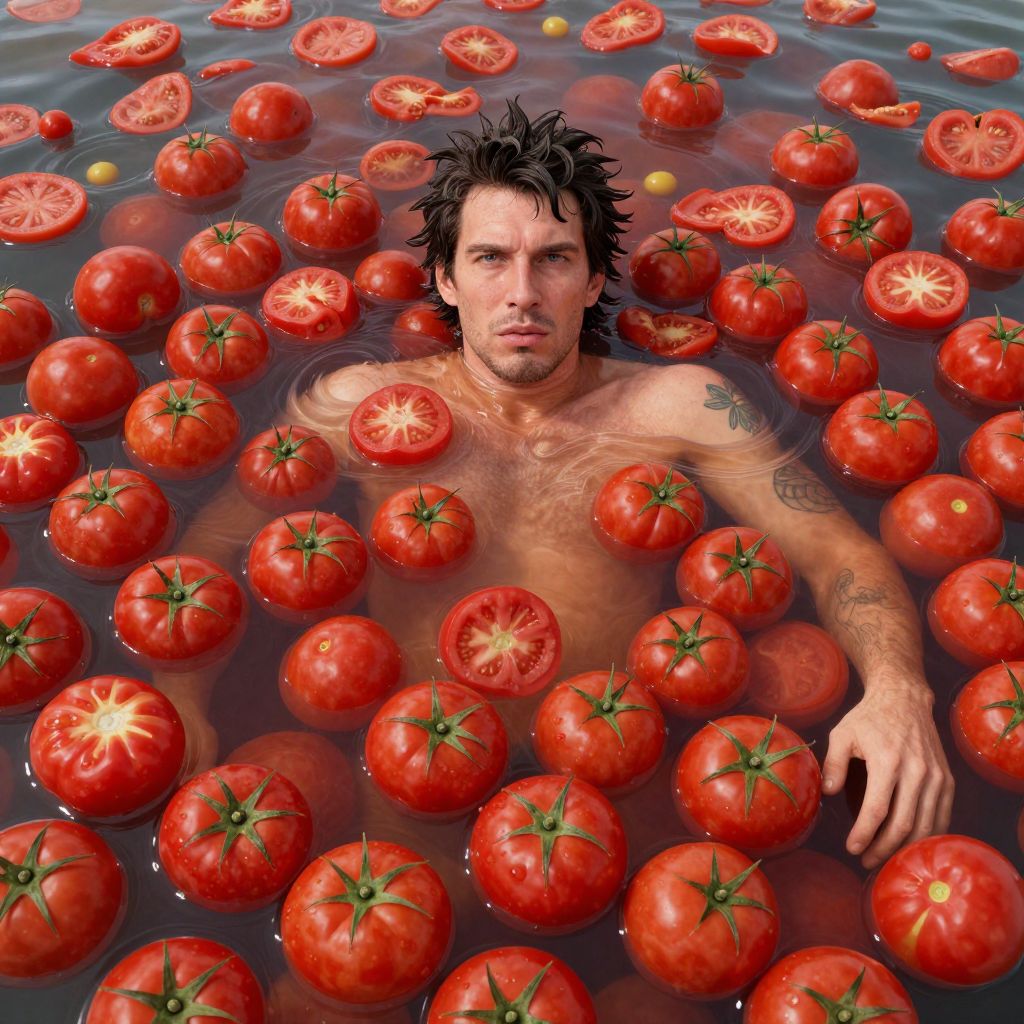 A realistic digital artwork depicts a shirtless, dark-haired man with tattoos, floating in a water-filled tub filled with numerous red, ripe tomatoes. His wet hair is slightly tousled, and he has a serious expression. The tomatoes, some whole and some halved, float around him, creating a vibrant, colorful scene. The water is clear, revealing the tomatoes' bright red hues and green stems. The man's right arm rests on the tub's edge, while his left arm floats beside him. The image has a surreal, slightly dramatic quality, with the contrast between the man's pale skin and the vivid tomatoes.