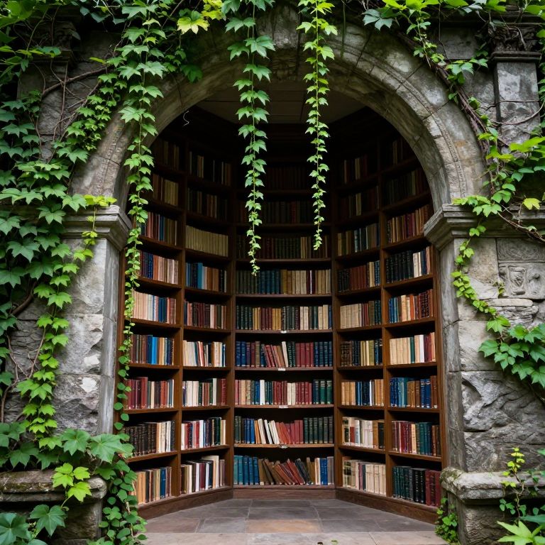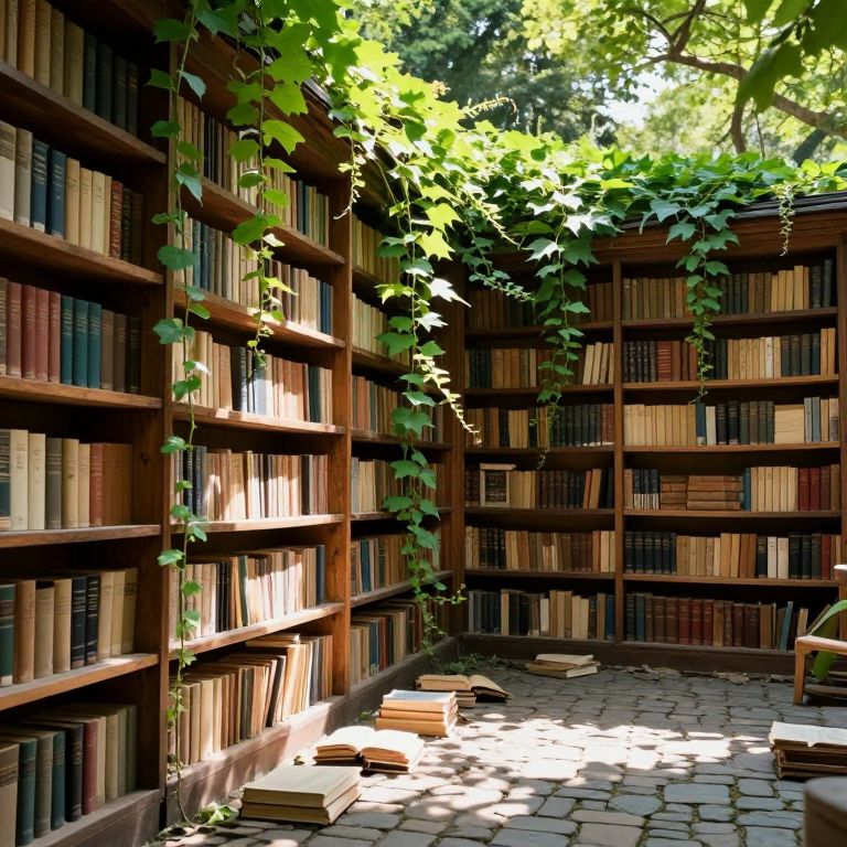 Photograph of a sunlit, leafy library corner with tall wooden bookshelves filled with colorful books, vines hanging down, and stacked books on