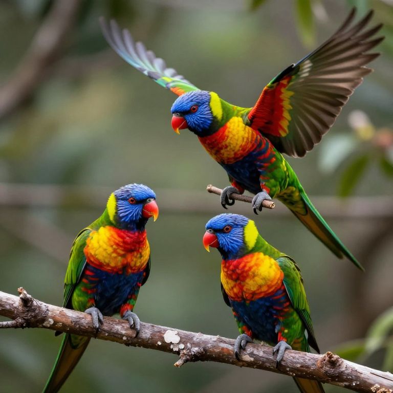 In this stunning image, three vibrant rainbow lorikeets are dramatically posed on separate branches of a tree, each showcasing their striking colors and intricate details. The lorikeets, with their iridescent blue heads, green and orange bodies, and red and yellow accents, are captured in a photorealistic manner, with ray tracing and sharp detail enhancing their lifelike appearance. The image is rendered in 8K quality, with HDR and sharp focus, ensuring that every feather and feather detail is beautifully coded by color. The lorikeets are arranged in a dynamic composition, with one bird spreading its wings as it lands on a branch, adding a sense of movement and depth to the scene. The background is a lush, natural setting, with a depth of field effect that keeps the lorikeets in sharp focus while softly blurring the foliage, creating a cinematic feel. The white balance is perfectly adjusted, allowing the colors to pop and the textures to be vividly rendered. The overall composition is a harmonious blend of color, texture, and form, capturing the essence of these stunning birds in their natural habitat.