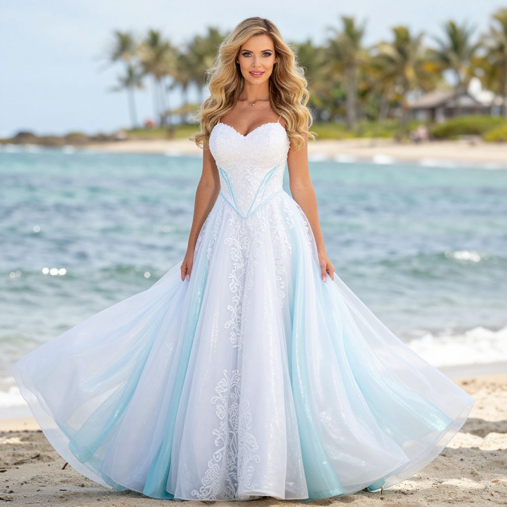 A realistic photographic shot of a young woman with long, wavy blonde hair and bright blue eyes wearing a stunning Disney Ariel wedding dress, the dress featuring a flowing, sea-inspired design with a white and blue shimmer, lace, and a dramatic, flowing skirt, set against a soft, sunny beach backdrop with turquoise waves and palm trees in the background, showing the dress in natural sunlight with subtle reflections on the water.. The woman has big tits and cute face