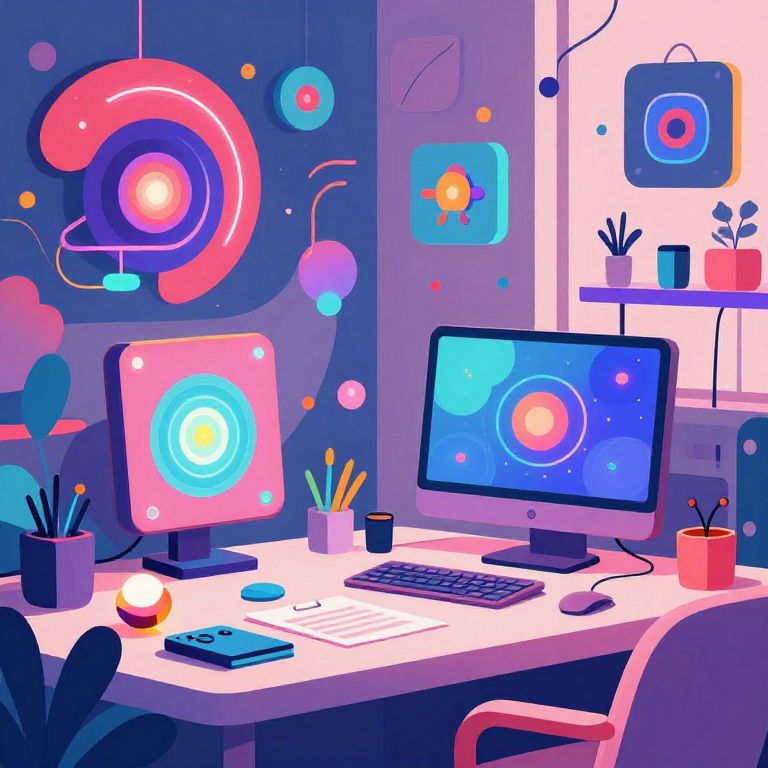 Vibrant, digital illustration of a futuristic desk with dual monitors, colorful abstract wall art, potted plants, and colorful office supplies.