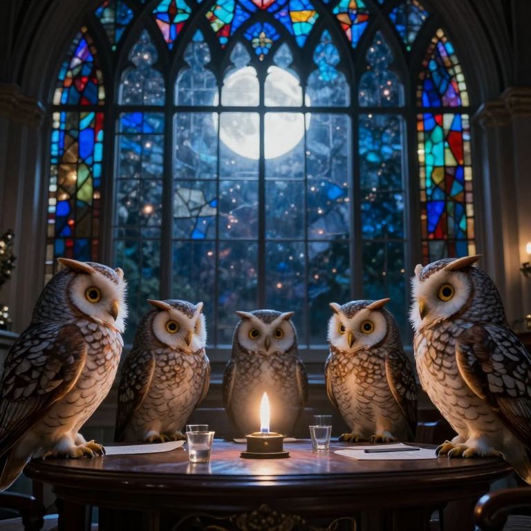 A parliament of owls debates the ethics of moonlight, casting vote-lights that flicker across a sky made of shifting stained glass.