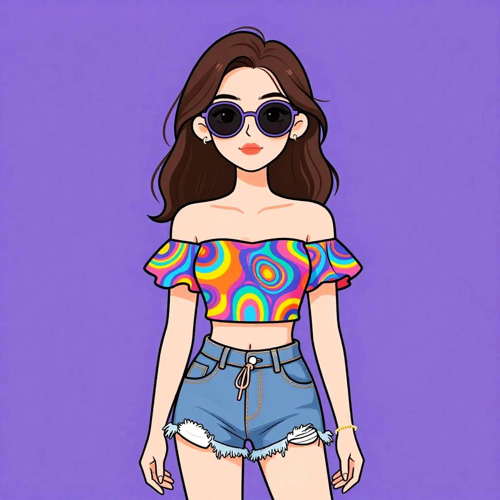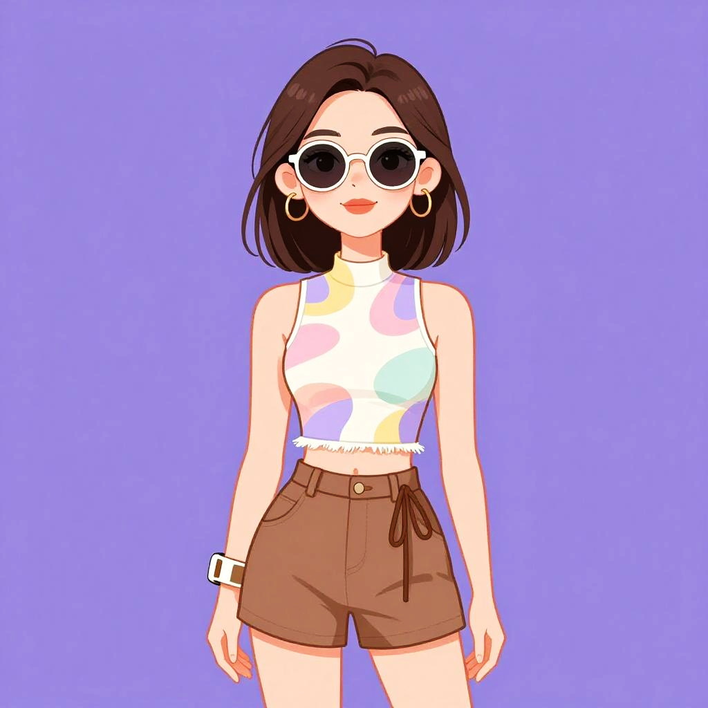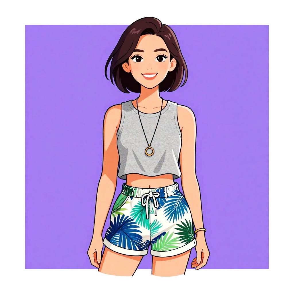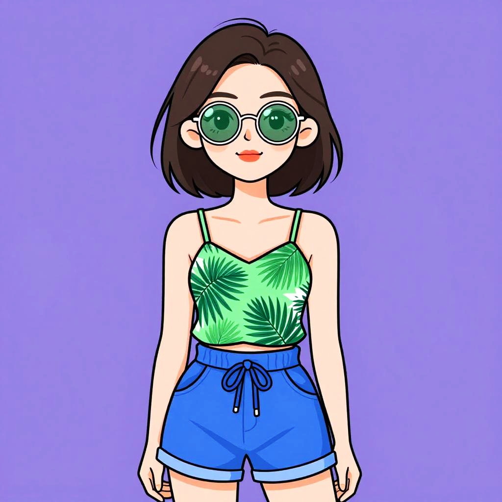 Woman with pretty face and pretty hair. Woman, summer clothing, tropical print camisole in shades of green with palm leaf patterns, thin straps, relaxed fit, royal blue shorts with a drawstring waist, round oversized sunglasses with a reflective green lens. --sref 1467