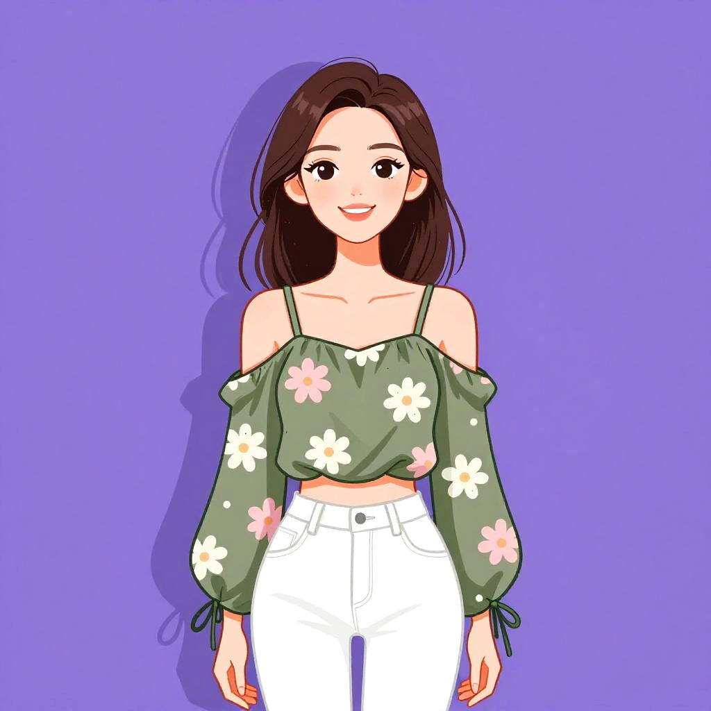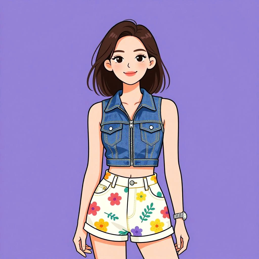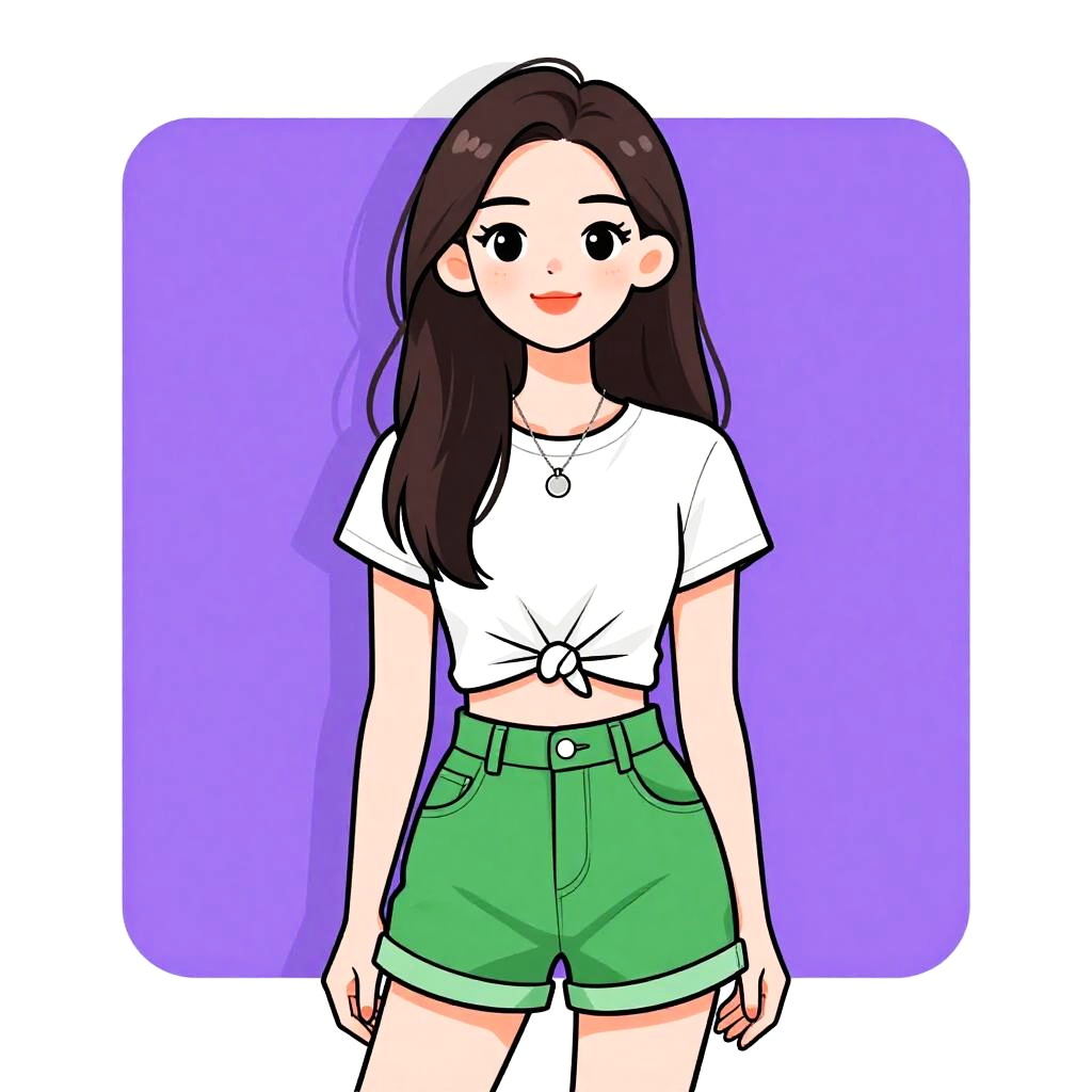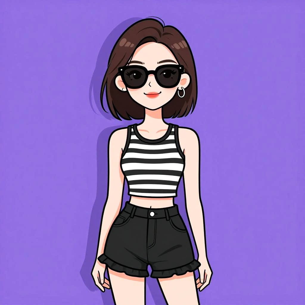 Woman with pretty face and pretty hair. Woman, summer clothing, tropical print camisole in shades of green with palm leaf patterns, thin straps, relaxed fit, royal blue shorts with a drawstring waist, round oversized sunglasses with a reflective green lens. --sref 1467